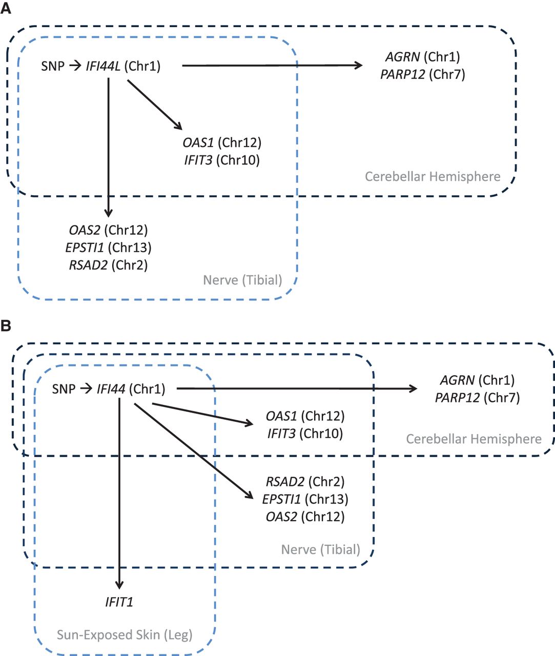 A biologically interpretable example of a cis-eGene (IFI44L) that appears to mediate the effects of trans-eSNPs in multiple tissues. The gene IFI44L (A) resides <5 kb away from IFI44 (B), and expression of these genes is associated with a common cis-eQTL that also impacts the expression of multiple genes in trans in multiple tissues. Both IFI44 and IFI44L show statistical evidence of mediation for a similar set of interferon-related genes. Thus, based on this evidence, we infer that at least one of these genes is a cis-mediator, although we cannot know which is (or if both are) the true mediator.