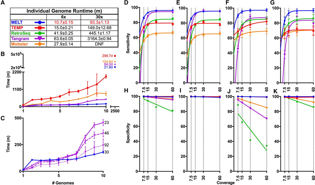 Comparisons of MEI discovery algorithms. (A–C) Runtime comparisons between MELT and four other MEI discovery algorithms: RetroSeq Mobster, Tangram, and TEMP. (A) Runtime in minutes on either a 6× or 30× coverage genome using a single processor (numbers are mean ± SD), with the best time for each coverage indicated in red. (B) Time required for each algorithm to analyze between one and 10 genomes using a distributed computing cluster. Shown to the right of experimental data are extrapolated estimates of the total runtimes for 2504 genomes with each algorithm. (C) Identical to B but depicting the median runtime for only MELT and Tangram. Tangram was run with 23, 46, or 92 threads (numbers to the right of lines). (D–G) Comparison of sensitivities for MELT and the MEI detection algorithms outlined above. False negative rates (FNRs) are plotted for (D) Aggregate, (E) Alu, (F) L1, and (G) SVA. (H–K) Comparison of specificities for MELT and the MEI detection algorithms outlined above. False discovery rates (FDRs) are plotted for (H) Aggregate, (I) Alu, (J) L1, and (K) SVA (Supplemental Table S5).