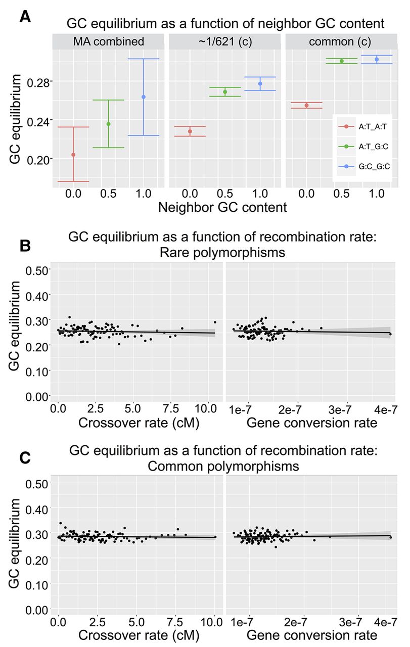 GC equilibrium. (A) The GC equilibrium in nonrepetitive regions as a function of the GC content of neighboring bases, within MA, singletons, and common polymorphisms. (B) GC equilibrium (using singletons ∼1(c)/621) in nonrepetitive regions as a function of the recombination rate, and (C) GC equilibrium (using common(c) polymorphisms) in nonrepetitive regions as a function of the recombination rate.
