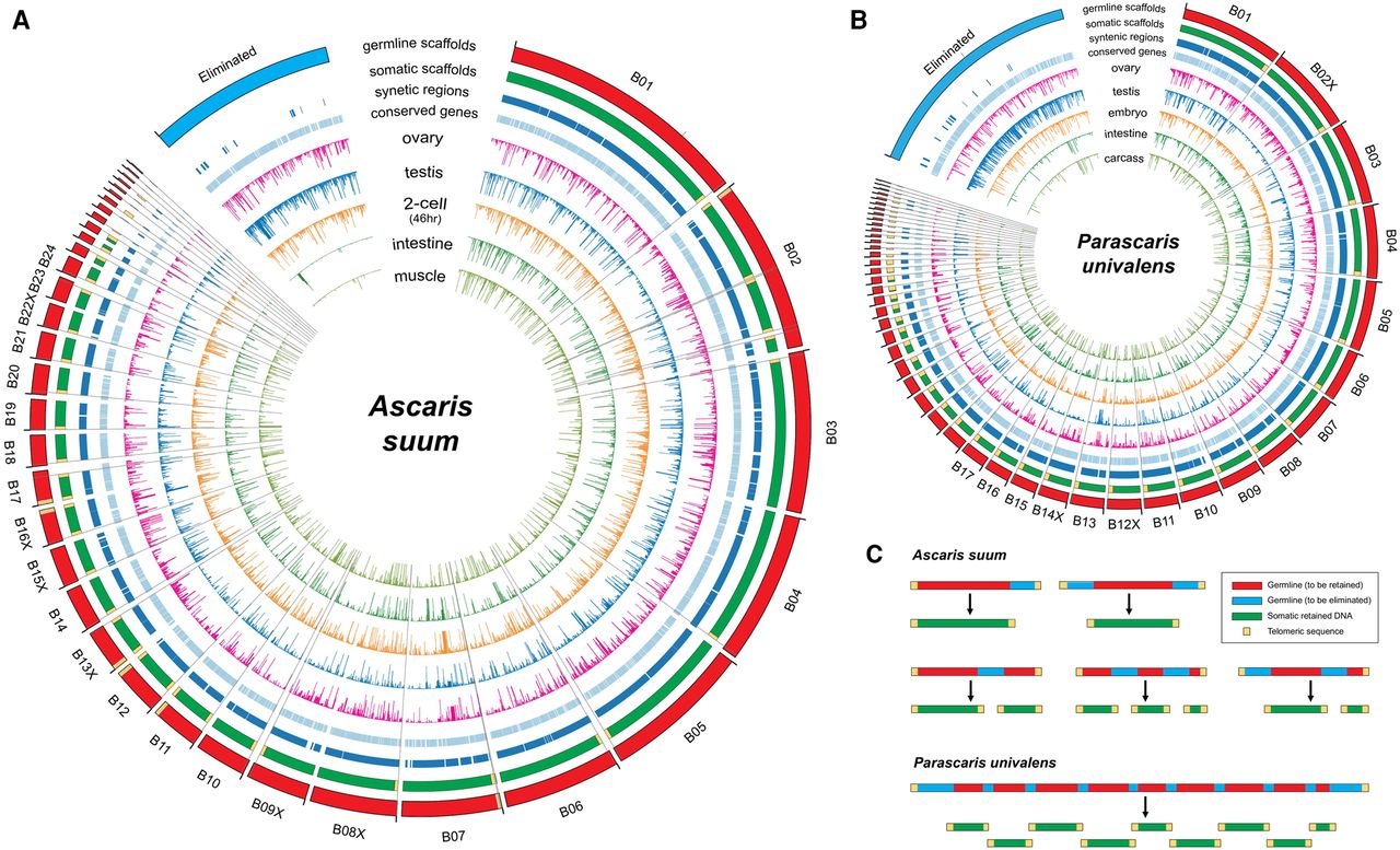 Ascaris and Parascaris programmed DNA elimination genome changes. (A) Breakpoints and eliminated sequences in Ascaris. Illustrated are Ascaris genomic regions (scaffolds) that are partially or completely eliminated (blue in germline scaffold ring). Scaffolds with DNA breakpoints are shown in red within the germline scaffolds ring (the largest outer circle). The positions for the 40 identified DNA break regions are shown as black lines connecting the largest and smallest circles. Genomic regions (scaffolds) eliminated were concatenated for illustration and are shown as a blue block (ring). The somatic scaffolds track indicates the retained somatic sequences. Telomeres are indicated as yellow boxes. Note that all breaks are healed by new telomere addition. The syntenic regions and conserved genes between Ascaris and Parascaris are illustrated in the light blue ring/track. Gene transcript levels (derived from RNA-seq data) for the germline, two-cell embryo, and several somatic tissues are illustrated in the inner circles. Note the high level of RNA expression in the testis corresponding to DNA eliminated regions. In addition, a few of the eliminated genes (six out of 921) appear to be expressed in the soma due to paralogous genes that are retained or to low level contamination of highly expressed germline genes (see Supplemental Text). (B) Breakpoints and eliminated sequences in Parascaris. Presentation is the same as in Figure 3A. Circle plots are not drawn to scale. (C) DNA elimination at the chromosome level in Ascaris and Parascaris (see text).