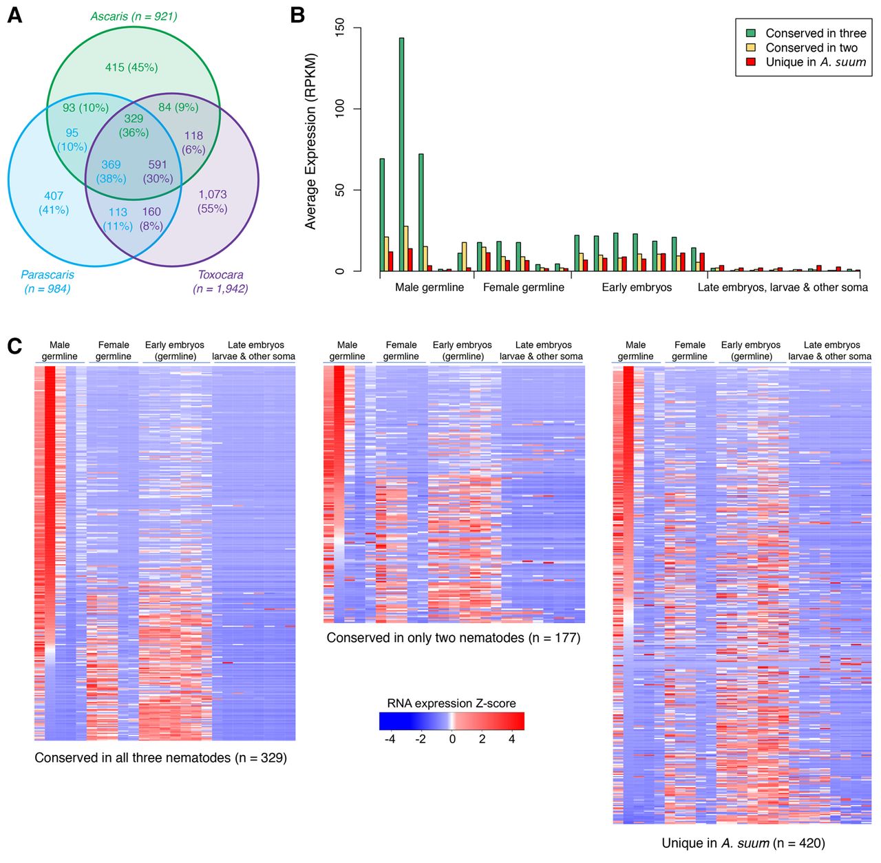Conservation of eliminated nematode genes and their expression during spermatogenesis. (A) Conservation of eliminated genes among Ascaris, Parascaris, and Toxocara (see Supplemental Material). The color-coded values illustrate the direct gene comparison for each genus. Note that there is more than one value as not all gene comparisons among these nematodes correspond to a 1:1 match. (B) Expression of Ascaris genes that are eliminated in all three nematodes, eliminated in two nematodes, or the eliminated genes unique to Ascaris (for description of the stages, see Fig. 2D). (C) Heatmap showing the expression of conserved versus nonconserved eliminated Ascaris genes in different developmental stages (for description of the stages, see Fig. 2D).