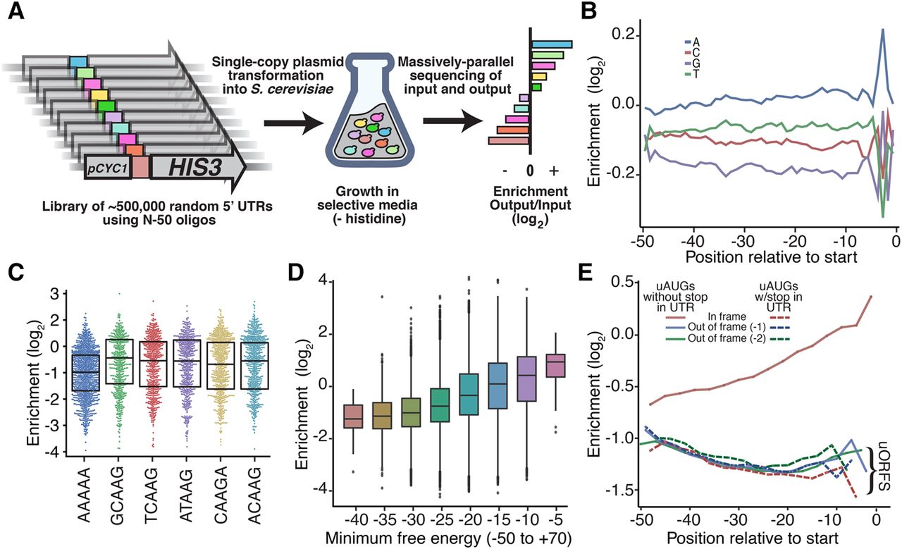 Experimental design and biological discovery. (A) Experimental design of a liquid-based growth assay of 489,348 5′ UTR variants. Random 50 nt were introduced directly upstream of the HIS3 coding sequence, replacing the 56 nt of the 5′ UTR of the CYC1 promoter. These constructs were introduced into a low copy number plasmid, transformed into yeast without a native copy of HIS3, and competed in media lacking histidine. The enrichment of each UTR after growth was measured by using massively parallel sequencing before and after selection. (B) 5′ UTR enrichment scores per nucleotide were averaged at each position. (C) The Kozak sequences (−5 to −1 position) leading to the highest His3 protein expression compared to the most abundant yeast Kozak sequence (AAAAA). (D) The enrichment of 5′ UTRs based on the predicted minimum free energy of the −50 to +70 sequences. (E) The enrichment of 5′ UTRs based on the presence of an upstream AUG (uAUG) and a stop codon within the UTR. Upstream open reading frames (uORFs) are characterized by an in-frame uAUG followed by a termination codon before the primary ORF start codon, or an out-of-frame uAUG followed by a stop codon before or after the primary ORF start codon.