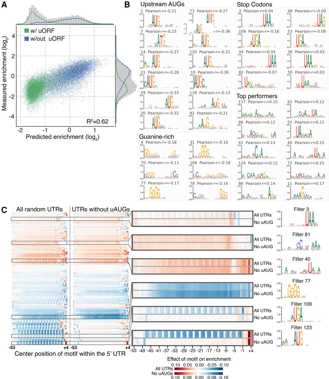 A convolutional neural network (CNN) approach to model random 5′ UTR sequences. (A) A three-layer convolutional neural network model trained on random 5′ UTRs was tested on a held-out test set of the top 5% based on input read depth. Tested 5′ UTRs are specified by color for those with or without an upstream open reading frame. (B) Four hundred eighty-eight thousand random 13-mers were scored for each filter in layer 1 of the CNN. The top 1000 13-mers were used to create a positional weight matrix (PWM) for each filter. These PWMs include motifs of start codons, stop codons, and guanine quadruplexes. Positive Pearson correlations indicate a positive effect on enrichment, while negative correlations indicate a negative effect on enrichment. (C) The effect of each motif per position was measured by assessing the Pearson correlation of motif score and enrichment at each position. Heat maps of all 5′ UTRs (left) and those lacking upstream AUGs (right), including specific examples highlighting filters with different positional patterns are shown.