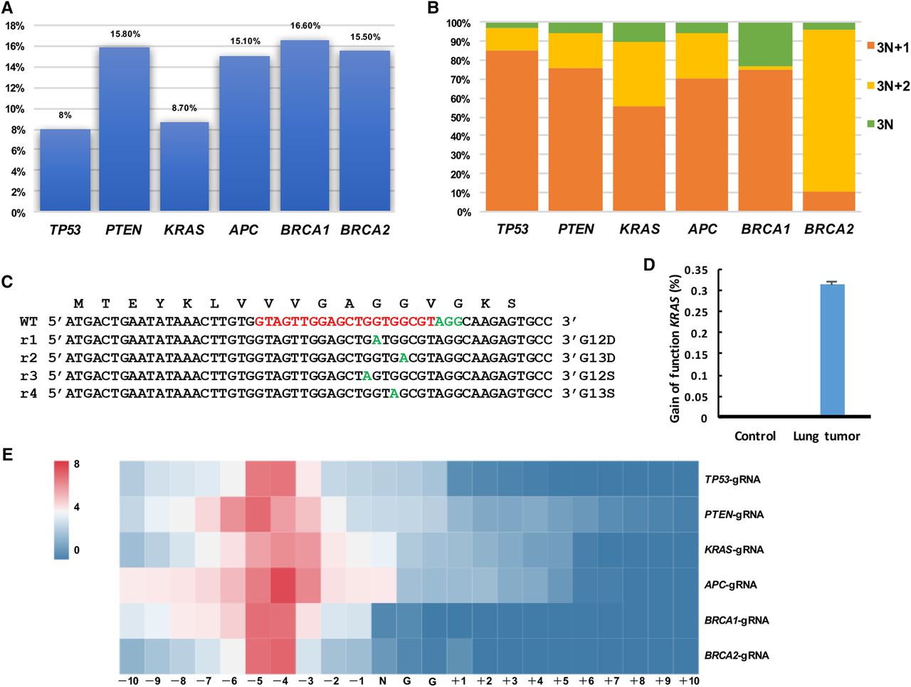 Mutation analysis in autochthonous lung tumors. (A) Efficiency of indel mutations in sectioned lung tumors was analyzed by deep sequencing. All six sgRNAs could induce indel mutations near the predicted cleavage sites (8.0% of TP53, 15.80% of PTEN, 8.70% of KRAS, 15.10% of APC, 16.60% of BRCA1, and 15.50% of BRCA2). (B) Calculation of mutation patterns (3N, 3N + 1, and 3N + 2) in sectioned lung tumors. (C,D) Gain-of-function mutations of KRAS in tumor cells. (E) Heat map analysis of the mutation efficiency at each position (−10 bp–+10 bp) around PAM sites with different sgRNAs.