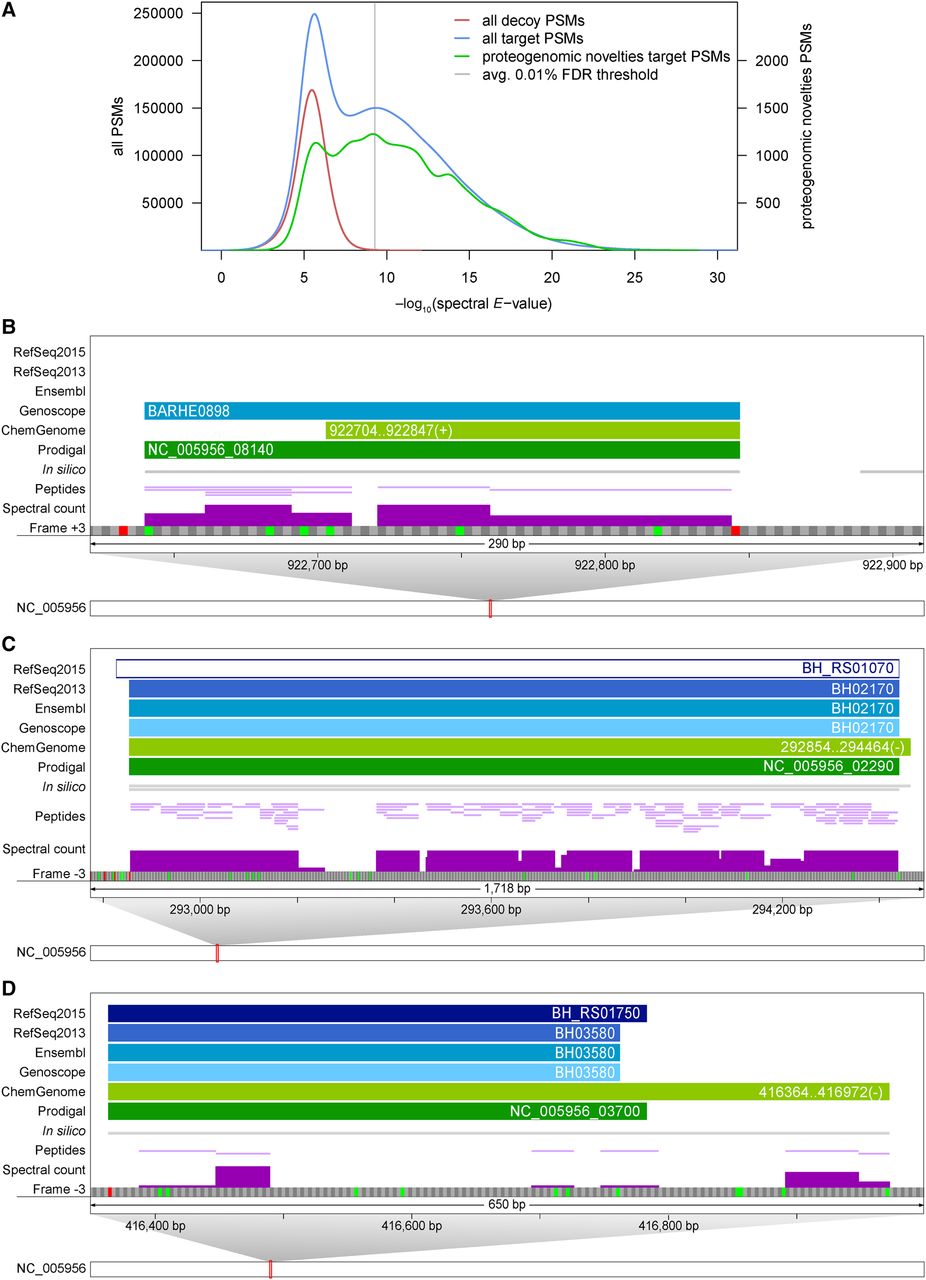 Examples of novel information uncovered by integrative proteogenomics. (A) E-value distribution of PSMs against proteins of decoy and target DB (red and blue lines, left scale) plus the distribution of those PSMs that uncovered novelties (green line, right scale). A PSM level FDR cut-off of 0.01% was selected per sample. (B–D) Zoomed-in views of genomic regions that harbor novelties. For illustration, a single frame of the forward/reverse strand with possible start (green) and stop codons (red) is shown, along with annotations and experimental evidence (spectral counts scaled from 0 to 20). (B) Example of a novel sORF of 68 amino acids (BARHE0898, frame +3). (C) Example of a highly expressed pseudogene (RefSeq2015: BH_RS01070, frame −3); 2244 spectra are mapped to 117 peptides of NusA, which is annotated as a pseudogene in RefSeq2015 for unknown reasons. There is no experimental evidence for the +8-aa N-terminal extension predicted by ChemGenome. (D) Proteomic expression evidence supports a 63-aa-longer proteoform of BH_RS01750 (frame −3) uniquely predicted by ChemGenome.