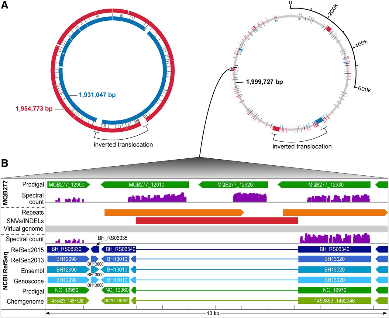 Comparative analysis in the context of experimental data. Integrated visualization of two closely related genomes through a virtual genome concept. (A) On the left, the Bhen NCBI RefSeq genome (inner blue circle) is aligned to our de novo assembly (outer red circle). A large inversion-translocation (black bracket) is marked; several insertions or deletions in either genome are shown (white spaces) and a center track for single nucleotide variations (SNVs). To the right, the virtual genome (gray) is shown which incorporates both genome sequences, including all differences, into a common coordinate system. Unique sequences are shown in blue or red (the inversion-translocation present in both genomes is left as is). (B) Zoom into the region harboring a 6088-bp insertion in MQB277 (red bar), showing annotations for the RefSeq genome (below the virtual genome track) and assembly (above the virtual genome track), plus experimental proteomics evidence mapped against both genomes (spectral count scaled from 0–800). This region harbors a direct repeat only in the assembly (orange bars). Three CDSs (MQB277_12910, MQB277_12920, MQB277_12930) annotated as autotransporters are highly expressed; the first two (novel CDSs) are only detected (unambiguous 1a peptides) with the correct genome sequence available.