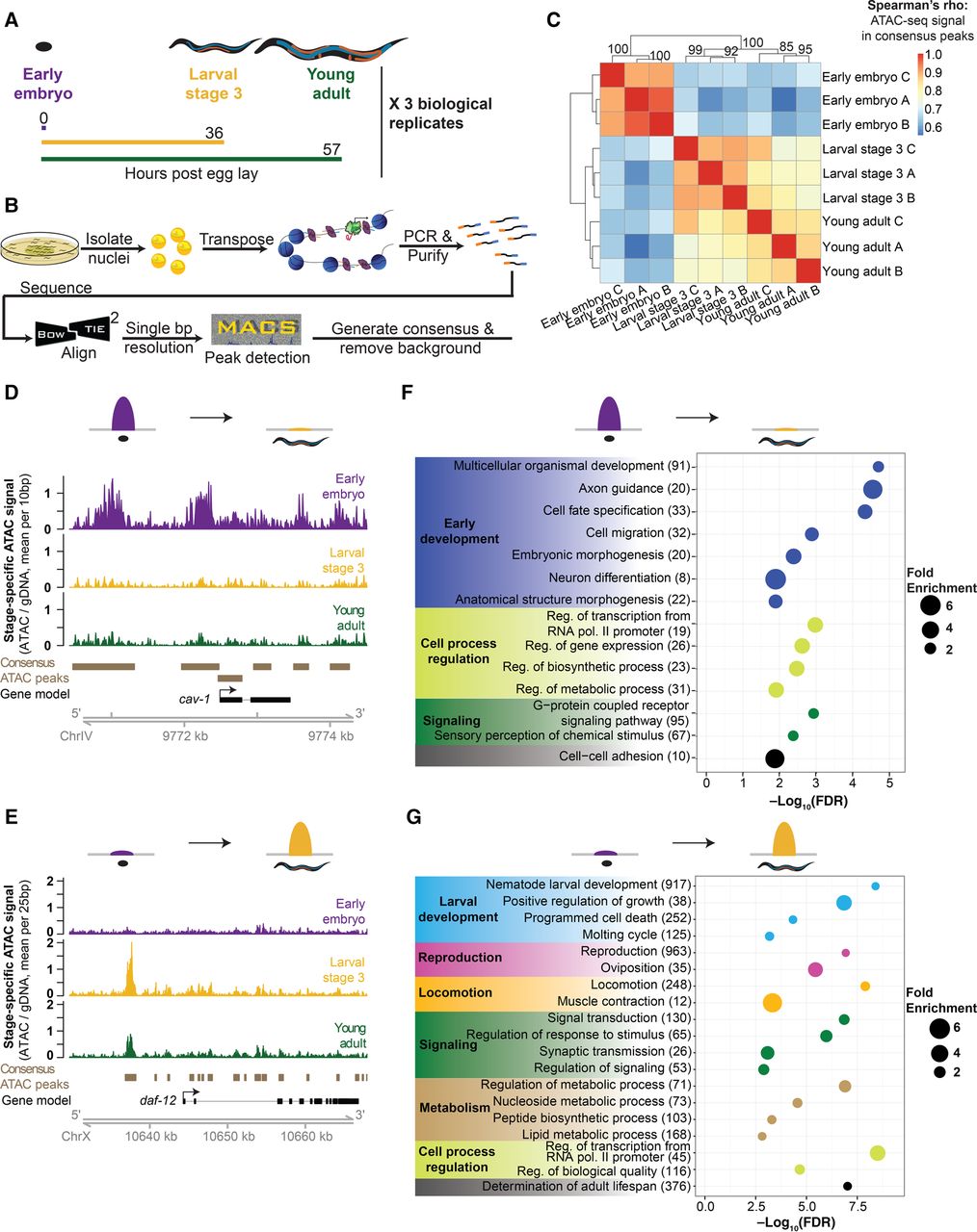 ATAC-seq in whole C. elegans captures chromatin accessibility dynamics across three life-stages. (A) Three independent biological replicates each consisting of tightly temporally synchronized C. elegans were used for ATAC-seq. Hours post-egg lay are at 20°C. (B) C. elegans were flash frozen and nuclei were isolated before assaying accessible chromatin using transposons loaded with next-generation sequencing adaptors, allowing paired-end sequencing. A custom analysis pipeline emphasizing high-resolution signal and consistent peaks, as well as accommodating input control, was developed to generate stage-specific and consensus (i.e., across stages) ATAC-seq peaks. (C) ATAC-seq signal within consensus ATAC-seq peaks was compared between all samples using Spearman's ρ to cluster samples. Replicate batches are noted as letters following the stage. (D,E) Comparison of ATAC-seq signal (normalized by total sequencing depth) between all three stages at a region that decreases (D) or increases (E) in accessibility during development. (F,G) Genes that lose accessibility between embryo and larval stage 3 (L3) are enriched for early development functions (F), while genes that gain accessibility are enriched for larval-related functions (G); all calculations and genes lists are from GOrilla (Eden et al. 2009), and the number of genes enriched in each term are listed in parentheses.