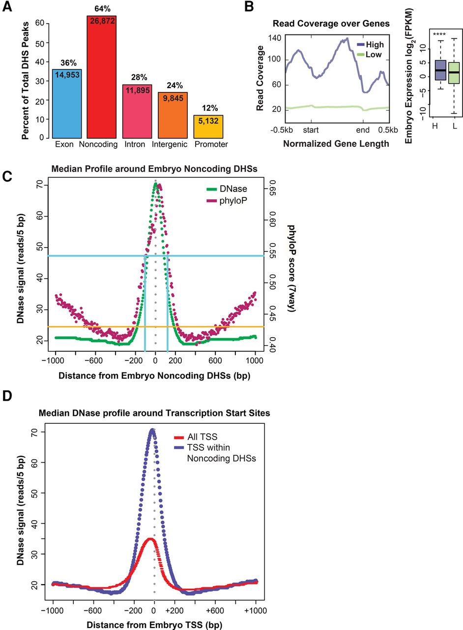 Noncoding DHSs are highly conserved and accessible to DNase. (A) Noncoding DHSs are abundant in the embryo. Embryo DHSs were annotated according to position relative to WormBase WS241 protein-coding genes: exons (blue) and noncoding (red). Noncoding DHSs are further subdivided into introns (pink), promoter (defined as <300 bp 5′ of ATG; yellow), and intergenic (orange) regions. (B) Protein-coding genes with higher DNase accessibility have higher expression. Read coverage (Total DNase signal across biological replicates) was measured for length-normalized protein-coding genes and 1 kb of surrounding sequence. k-means clustering of genes by read coverage was used to find genes with higher (high) and lower read coverage (low). Embryo expression (measured in log2 of FPKM from Zhong et al. 2010) was compared between higher (H) versus lower (L) read coverage genes. (C) Embryo noncoding DHSs are highly conserved and highly accessible to DNase. Median DNase signal (green; measured in 5-bp windows) and phyloP sequence conservation score (pink; seven-way) are measured across 2 kb of sequence centering around embryo noncoding DHSs. Read coverage maximizes at 70.5 reads in a 5-bp window and phyloP sequence conservation at 0.66. In comparison, phyloP conservation is 0.54 (blue) for known true positive lin-39/ceh-13 (Kuntz et al. 2008) and is 0.43 for negative control nonenhancer regions (orange line). (D) Median DNase signal peaks at C. elegans transcription start sites (TSS) and shows a 5′ bias. Median DNase signal (measured in 5-bp windows) is measured across 2 kb of sequence centering around embryo TSS (locations from Chen et al. 2013), with 5′ to 3′ shown from left to right (following the direction of transcription). Center of the TSS is by gray dotted line. DNase signal peaks at All TSS (red) and at TSS within noncoding DHSs (purple) and shows strongest DNase accessibility just 5′ to the TSS.