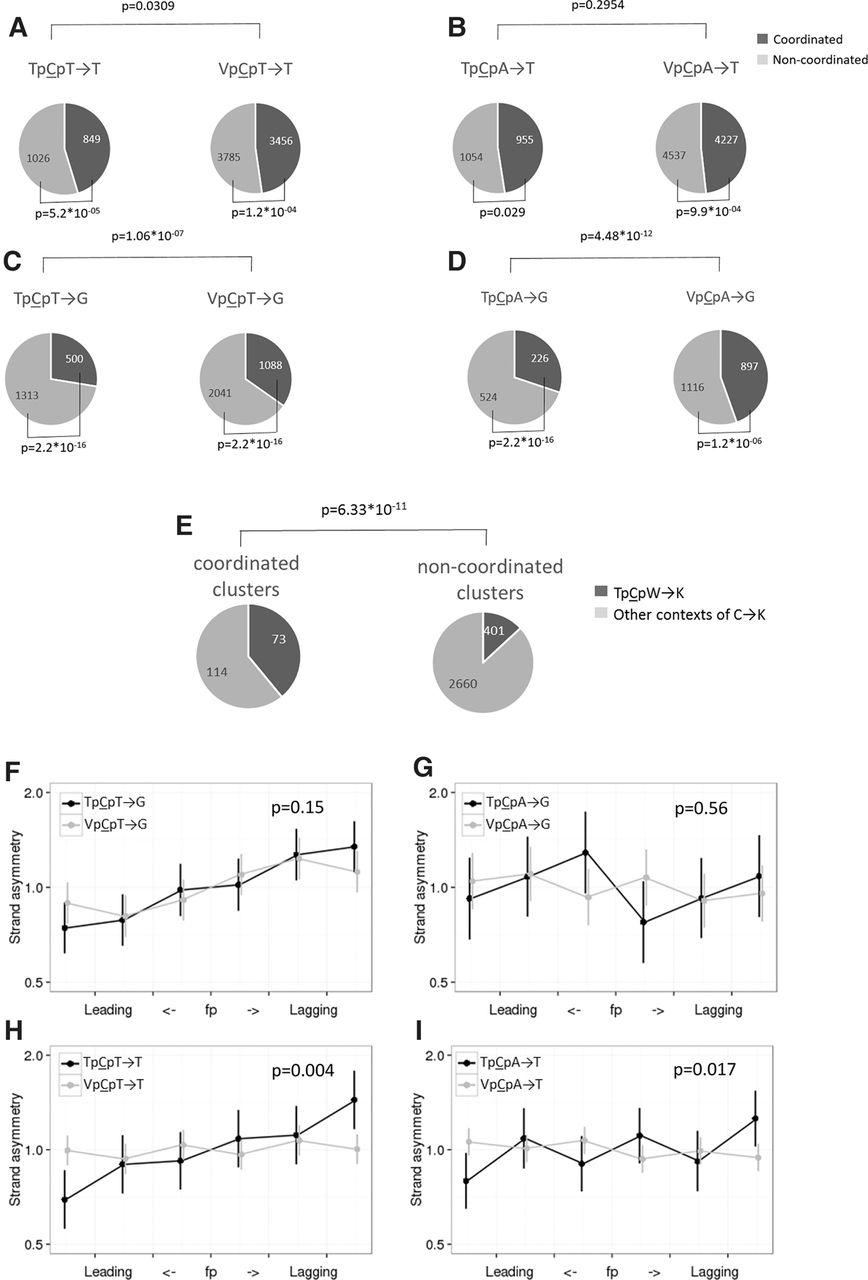 Clustered mutations in the TpCpW→K context are enriched in strand-coordinated clusters and biased toward the lagging strand. (A–D) Pairs of linked SNPs in contexts prone to APOBEC3A/B-induced mutations tend to be strand coordinated. (E) Strand-coordinated clusters that are composed exclusively of C→K mutations and contain at least six mutations are approximately threefold enriched in mutations in the TpCpW context, compared with noncoordinated clusters. (F–I) Strand-coordinated pairs are biased toward the lagging strand. The axes and notation are as in Figure 1. The P-value is calculated for the differences between the asymmetries of TpCpW→K and VpCpW→K mutations in the regions with the highest fork polarity (i.e., the first and the last bin).