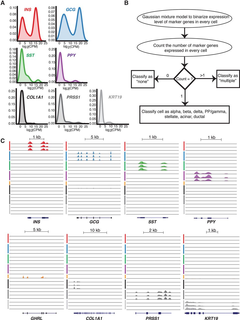 Cell-type classification based on marker gene expression. (A) Density plots demonstrating endocrine and exocrine marker gene expression across all single cells. (B) Schematic of the Gaussian mixture model method applied to assign cell-type identity based on marker gene expression. (C) UCSC Genome Browser views of representative single-cell expression profiles of INS, GCG, SST, PPY, and GHRL genes encoding beta, alpha, delta, PP/gamma, and epsilon cell hormones of the endocrine pancreas, respectively, and marker genes for stellate (COL1A1), acinar (PRSS1), and ductal (KRT19) cells of the exocrine pancreas. Line colors indicate putative beta (red), alpha (blue), delta (green), PP/gamma (purple), epsilon (orange), stellate (black), acinar (dark gray), and ductal cells (light gray). (PP) pancreatic polypeptide; (CPM) counts per million.
