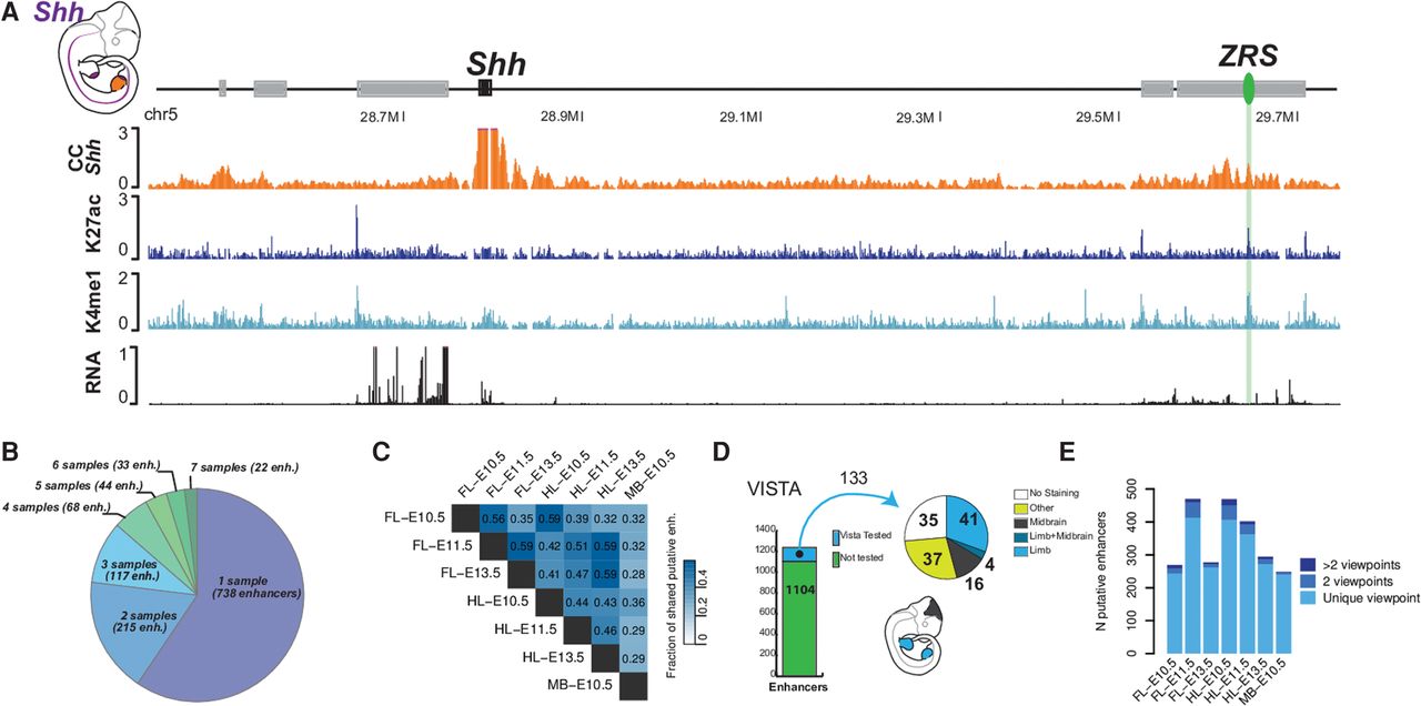 Annotation of enhancers at limb-associated loci. (A) The ZRS (green oval) is the only limb enhancer called at the Shh locus. The expression pattern of Shh is indicated in purple in the embryo at the upper left corner of the scheme. (B) Number of tissues and/or time points (samples) where a specific putative enhancer is identified. Most of the putative enhancers are found solely in one sample and only a limited fraction is found in all of them. (C) Pairwise comparisons of enhancers’ reproducibility between tissues. The numbers represent the fraction of enhancers predicted in both tissues and/or time points. (D) Approximately 10% of the predicted limb enhancers have been tested in a LacZ assay by the VISTA consortium. (E) Some enhancers interact with different viewpoints, suggesting a shared regulatory activity.