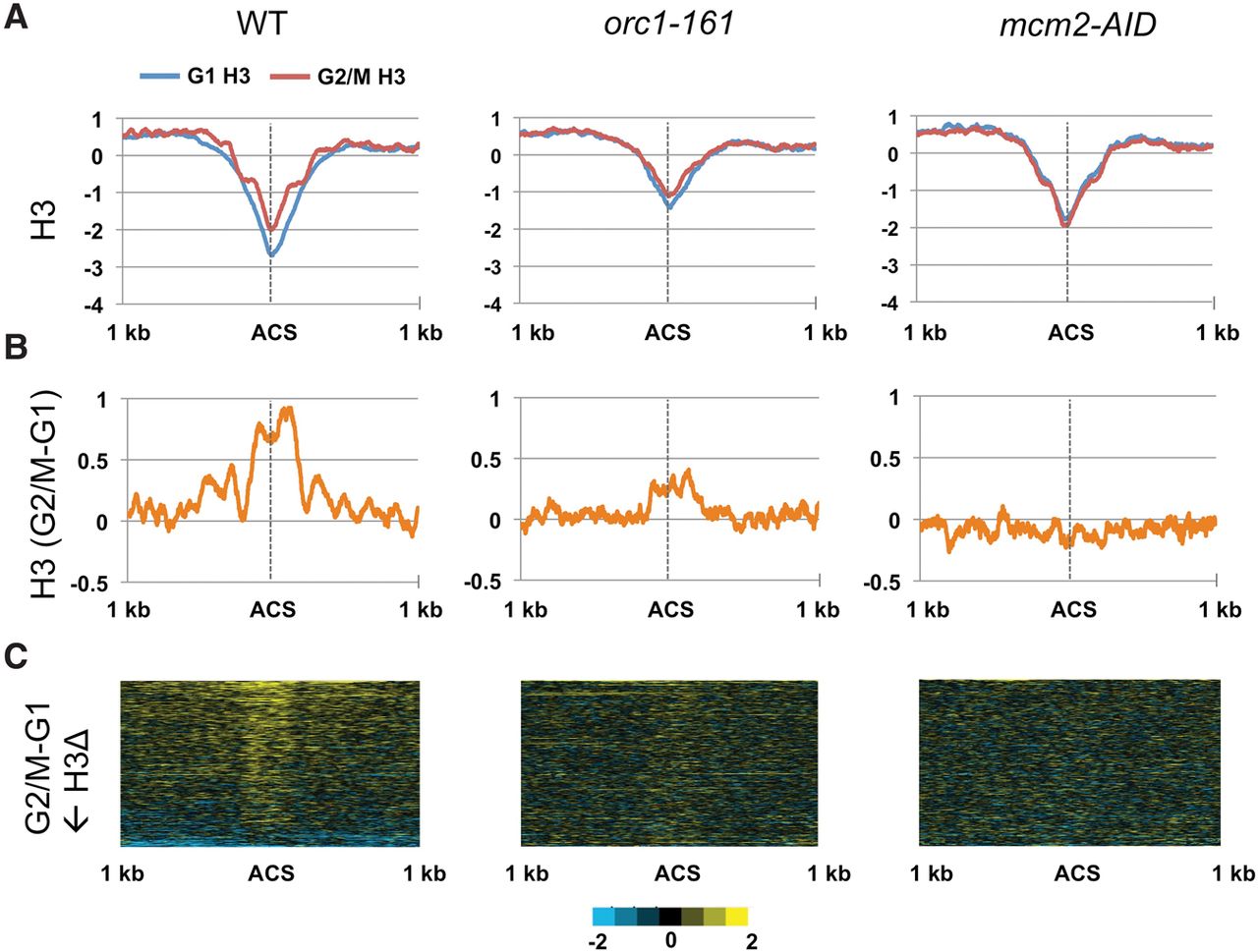 The decrease in nucleosome occupancy around origins from G2/M to G1 is pre-RC dependent. (A) The average nucleosome occupancy around ORC-bound origins in wild type (WT, left), orc1-161 (center), and mcm2-AID (right) cells in G1 (blue) and G2/M (red). (B) The degree of nucleosome loss between G2/M and G1 (log2) in WT (left), orc1-161 (center), and mcm2-AID (right) cells. (C) Heat maps of nucleosome occupancy loss at all ORC-bound origins that are ranked by the degree of the loss between G2/M and G1 in WT (left), orc1-161 (center), and mcm2-AID (right) cells. For the purposes of comparison, wild-type profiles are shown again from Figure 4.