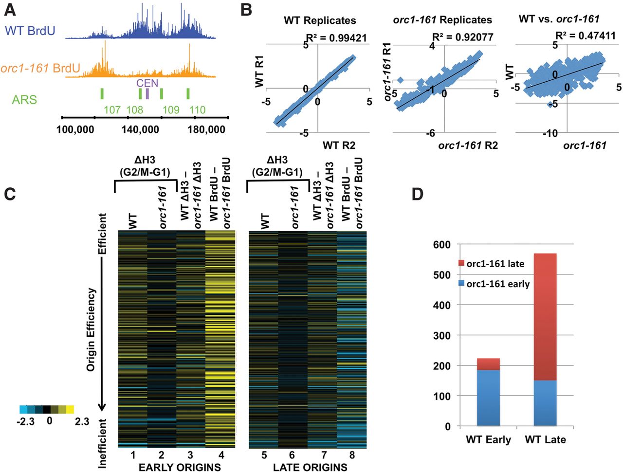 Reduction of nucleosome occupancy loss is accompanied with changes in origin usage profiles in orc1-161. (A) A snapshot of BrdU profiles for WT in blue and orc1-161 in orange. The region spans from 100,000 to 200,000 base pairs on Chromosome I. The green bars indicate annotated ARSs, and the purple bar indicates the centromere. (B) Graphs correlating averaged BrdU signals from all origins. Biological replicates of BrdU profiles from WT (left) and orc1-161 (center) were correlated. WT and orc1-161 profiles (right) were correlated with each other. (C) Heat maps showing the effects of the orc1-161 mutation on nucleosome occupancy and origin activity. Origins were separated by early and late firing, then ranked based on efficiency (OEM = −1 to 1) (McGuffee et al. 2013; Belsky et al. 2015). Each line represents an origin. Columns 1 and 5 show the changes in nucleosome occupancy between G2/M and G1 in wild-type cells. Columns 2 and 6 show the same in orc1-161 cells. Columns 3 and 7 show the differences in nucleosome occupancy changes between wild-type and orc1-161 cells (columns 1 subtracted by 2, and 5 subtracted by 6, respectively). Columns 4 and 8 show the differences in origin activity (BrdU signals) between wild-type and orc1-161 cells. (D) The effects of the orc1-161 mutation on origin firing time. BrdU profiling was performed in orc1-161 cells in the presence of 200 mM HU; origins that fired under this condition were designated as early firing origins, and those that do not fire were designated as late firing in the mutant. The left column shows the origins that fire early in wild-type cells, and the fraction of origins that are early and late firing in orc1-161 cells. The right column shows the origins that fire late in wild-type cells, and the fraction of origins that are early and late firing in orc1-161 cells.