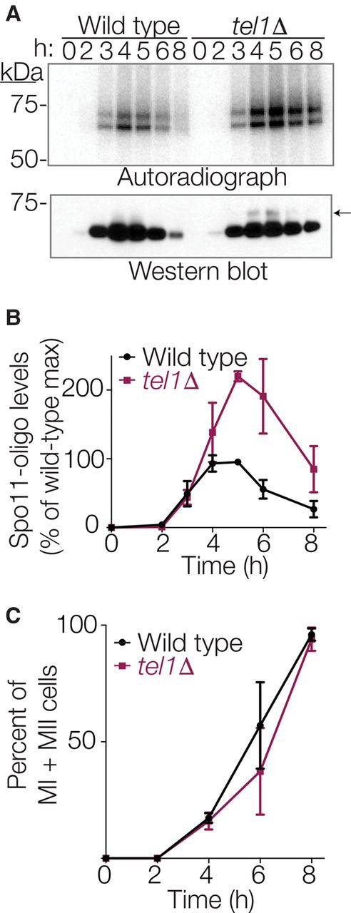 Elevated levels of Spo11-oligo complexes in tel1Δ mutants. (A) Representative time course. Autoradiograph of SDS-PAGE gel (top) shows radiolabeled Spo11-oligo complexes at the indicated times in sporulation medium. Anti-protein A Western blot (bottom) monitors total Spo11. Note that most signal in the Western blot is free Spo11, i.e., not bound to oligos. The arrow indicates the small amount of Spo11 protein that comigrates with slower migrating Spo11-oligo species, visible in the tel1Δ sample because of increased DSB numbers. (B) Quantification of radiolabeled Spo11-oligo complexes in tel1Δ cells, relative to wild-type cultures collected in parallel. Mean ± SD for three pairs of cultures is shown. (C) Meiotic progression (the percentage of cells completing one or both divisions). Mean ± SD for the same cultures as in B; ≥100 cells counted per time point.