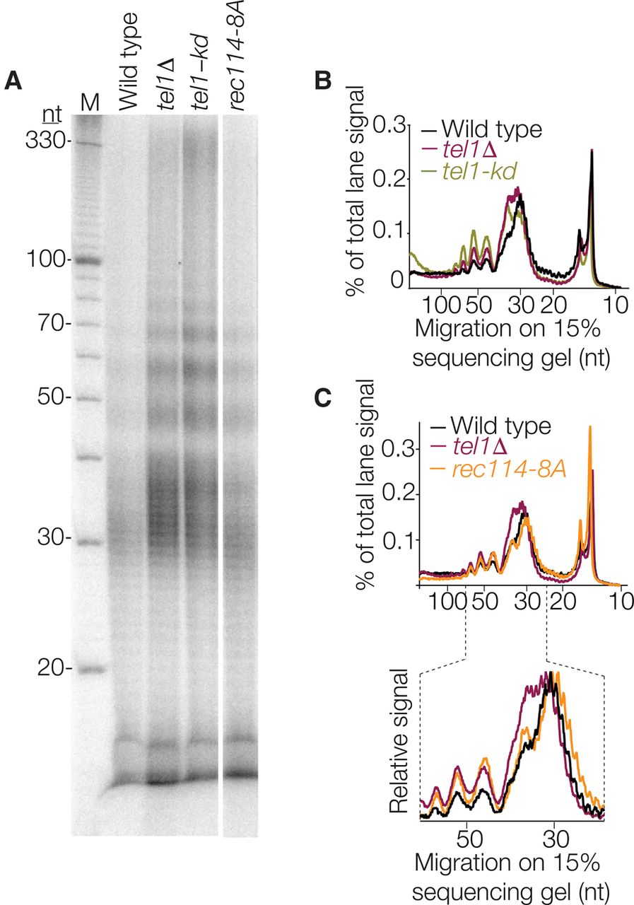 Sizes of Spo11 oligos in Tel1 pathway mutants. (A) Radiolabeled, de-proteinized Spo11 oligos separated on a denaturing 15% polyacrylamide sequencing gel. Lanes are from a single gel with an intervening lane omitted. (M) 10-nt ladder. Note that oligos from lower-molecular-weight Spo11-oligo complexes are underrepresented because most of the shortest oligos (less than ∼12 nt) are lost upon ethanol precipitation. (B,C) Lane profiles from panel A.