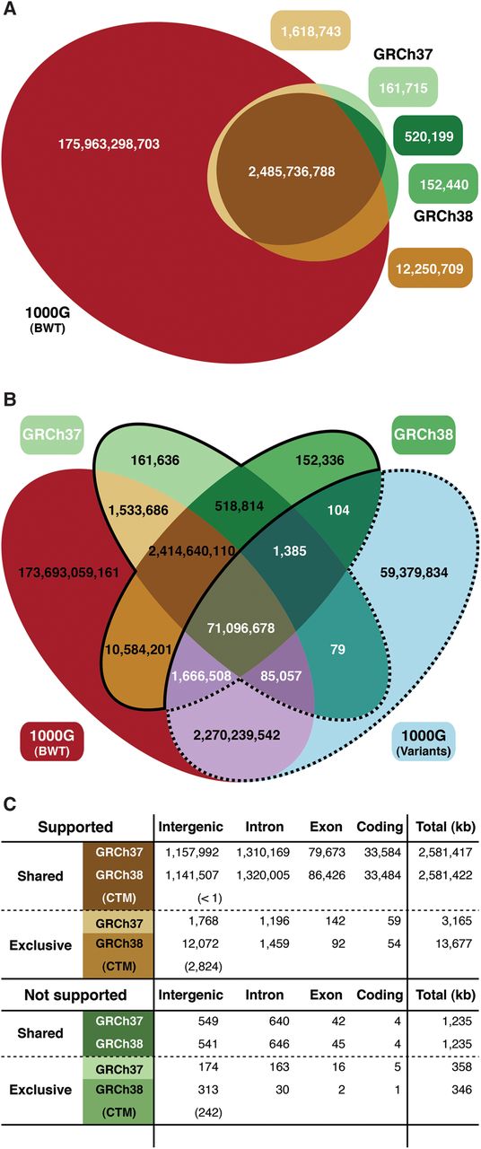 (A) 31-mer intersection of two human reference assemblies (GRCh37 and GRCh38) and the 1000GP population BWT. (B) 31-mer intersection of two human reference assemblies, 1000GP population BWT, and all 31-mers generated from the 1000GP phase 3 SNP and indel variants (The 1000 Genomes Project Consortium 2015). 31-mers shared between reference sets and variant set (white numbers) make up for ∼3% of each data set and almost all (99.998%) are supported by the 1000GP population BWT. (C) A breakdown of the regions on the two human assemblies with and without 1000GP population BWT support that are shared or exclusive to either genome build (all numbers are kbp), in four functional categories. (CTM) Centromeric sequence.