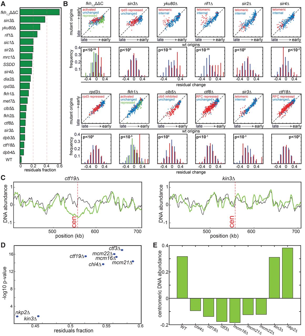 Mutants showing origin-specific effects. (A) Scoring mutants by the fraction of replication profile not explained by global changes. Shown are the fractions of the variances of the measured replication signals not explained by a model assuming no origin-specific effects. (B) Change in the replication timings of individual origins: For each mutant, the upper figure shows the inferred replication timing (DNA abundance) of each origin in the mutant vs. wild type. The group of origins predefined in previous experiments as regulated in the respective mutant is color-coded. The distributions of residual changes, following normalization by the predicted replicon length, are also shown (lower panel). P-values are measured based on a two-sample t-test (or one-way ANOVA in the case of the number of groups > 2) comparing the distribution of residuals in the regulated vs. unregulated origin groups. Origin classification is based on the following references: fkh1,2ΔΔC and fkh1Δ taken from Knott et al. (2012); rpd3Δ and sin3Δ were classified based on the up-regulated origins in rpd3Δ from Knott et al. (2009); ctf8Δ and ctf18Δ classification was taken from Crabbe et al. (2010). Classification of clb5Δ origins was taken from McCune et al. (2008). Subtelomeric origins in yku80Δ, rif1Δ, sir2Δ, sir3Δ, and sir4Δ were defined within 50 kb from the telomeres (Methods). (C) Replication profile around centromeres. Shown are the replication profiles around the centromere (marked in a dashed red line) of Chromosome 16 for the indicated strains (green) compared to the wild-type strain (black). (D) The unexplained profile score correlates with local changes. For the indicated strains, the unexplained percentage of the signal (x-axis) is compared to the significance of change in centromere replication. Significance is defined by the −log10(P-value) of a t-test comparing changes in replication time of centromeric vs. noncentromeric origins (y-axis). (E) DNA abundance around centromeric regions. Shown are 10-kb windows around the centromere for the indicated strains.
