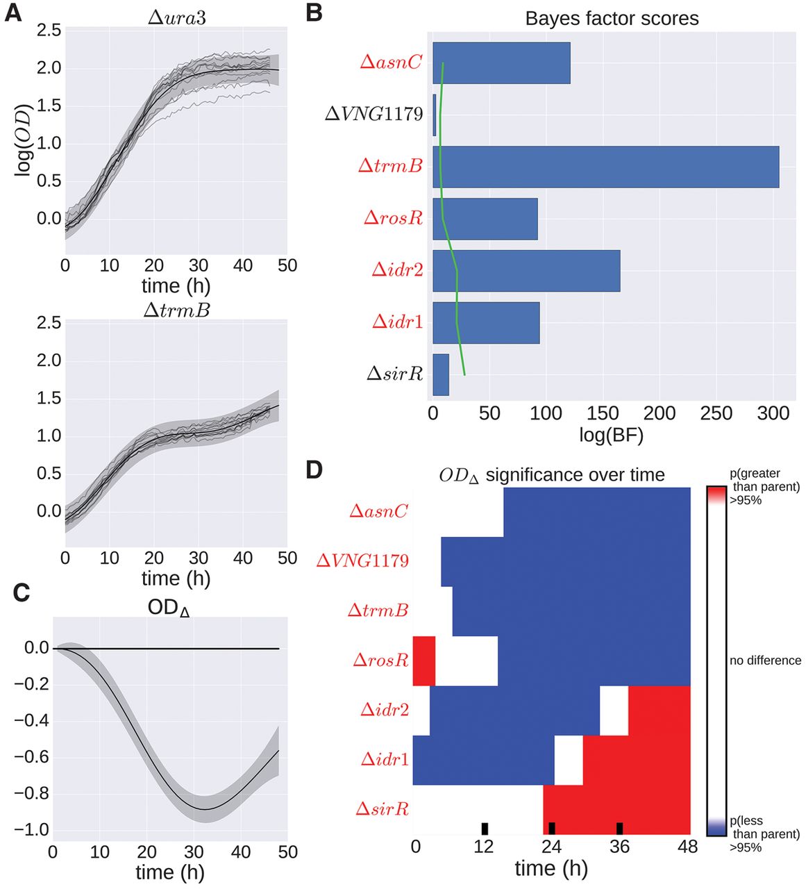 H. salinarum mutants with significant growth phenotypes under standard conditions. (A) Population growth data and GP model fit of H. salinarum parent strain Δura3 (top) and ΔtrmB (bottom) under standard growth. Light gray curves represent growth samples of each strain in different wells. Solid black lines and shaded gray regions indicate mean and 95% credible region of the GP model fit to the growth data, respectively. A single GP model was fit (equation 16) and separate growth predictions made for Δura3 and ΔtrmB (see Methods). (B) Bayes factors (BFs) for each mutant strain are shown as blue bars. Permuted BF scores representing an FDR ≤ 20% is indicated by the green line. Strains with a BF score with FDR ≤ 20% are in red italics. (C) The difference in growth level between ΔtrmB and Δura3 using the prediction of growth from the GP model. The solid line indicates mean difference, and the shaded region is the 95% credible region. Regions where the 95% credible region does not include zero suggest that the growth between the two strains is different at that time point with high probability. (D) Predicted difference between mutant and parent strain population growth using posterior function distributions as in the previous panel. Red and blue regions indicate a >95% probability that the mutant population growth is either higher or lower than the parent strain, respectively. Strains with ODΔ 95% credible region not including zero at any time point are in red italics.