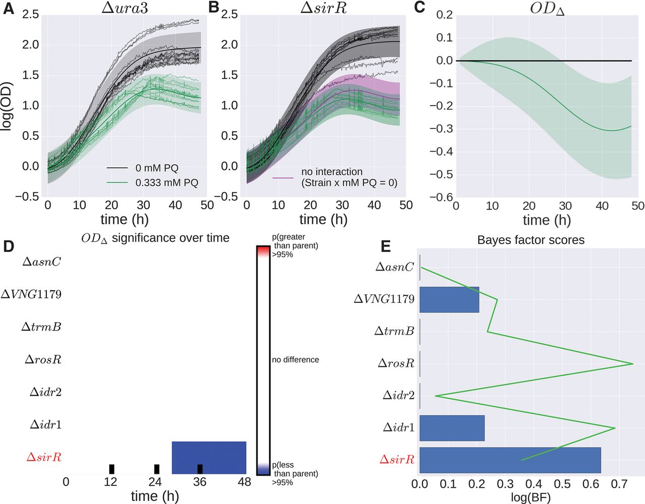 H. salinarum mutants with significant growth phenotypes under oxidative stress. (A,B) Example of population growth data from H. salinarum for mutant strain Δura3 (A) and ΔsirR (B) under standard conditions (black) and chronic oxidative stress (green). Each curve represents a different sample of an experimental condition. Gaussian process predictions for these conditions are shown as a solid line (mean) and shaded region (variance). The purple line represents the growth prediction when the Strain × mM PQ interaction term is zero. (C) Difference computed between the mutant growth level with interaction term (Strain × mM PQ = 1) and mutant growth without interaction (Strain × mM PQ = 0); solid lines represent mean, and shaded regions indicate 95% credible regions. (D) Functional difference and permuted BF scores for mutant strains in response to oxidative stress. Functional difference is computed between mutant strain with and without an interaction term between mutant and stress condition. (E) BF score and permuted BFs for each strain are shown, where blue bars and green line represent observed BF and FDR ≤ 20% threshold, respectively. Strains with FDR ≤ 20% are in red italics.