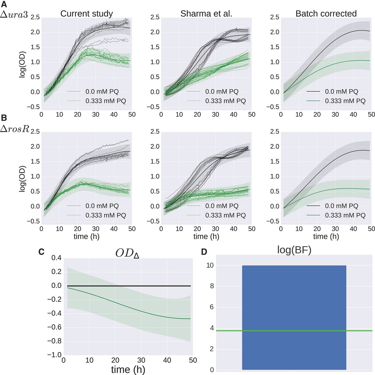 B-GREAT model of ΔrosR growth in response to oxidative stress across multiple studies. (A,B) Δura3 (A) and ΔrosR (B) growth data under standard conditions (black) and oxidative stress (green). Individual samples from this study (left) and previously published data (center) (Sharma et al. 2012) are shown as shaded lines. The B-GREAT model prediction for each condition is shown as solid line and shaded region for mean and 95% credible region, respectively. The growth prediction for the underlying growth function estimated across studies is shown in the right column. (C) The difference between ΔrosR and Δura3 growth for the underlying growth function corrected for batch effects, which shows an increased susceptibility of ΔrosR to oxidative stress relative to the parent strain. (D) log(BF) compared with permuted scores from the null distribution. Blue bar and green line represent observed BF and FDR ≤ 20% threshold, respectively.