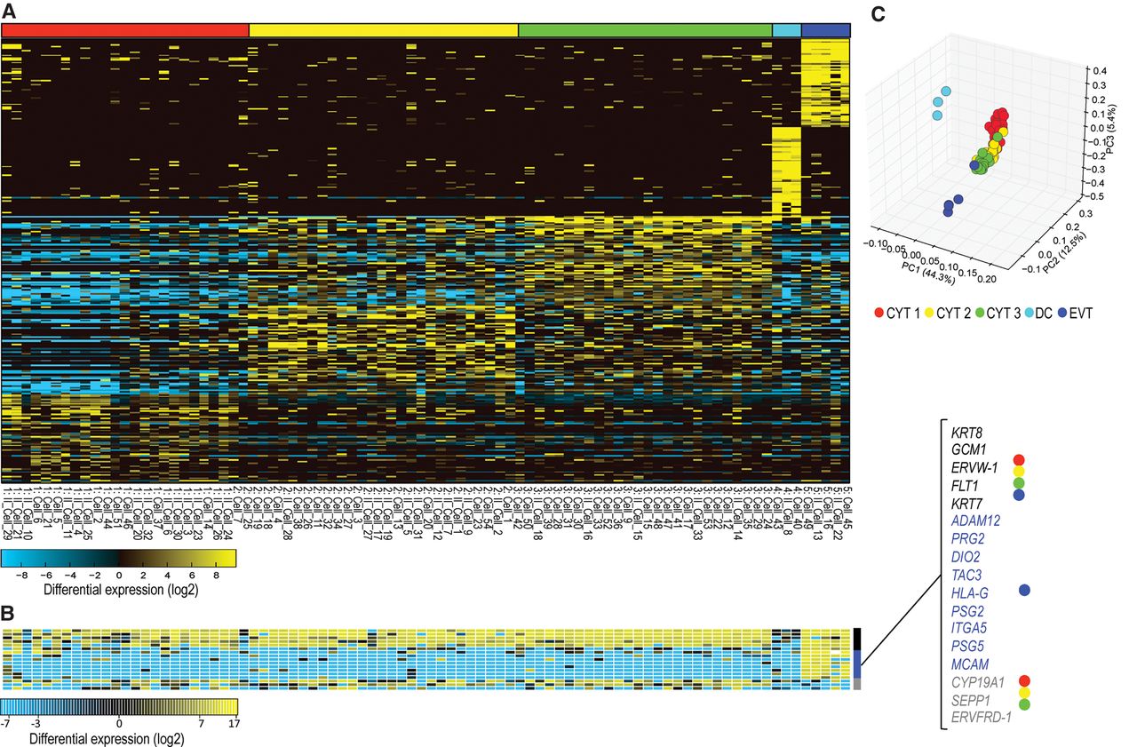 The gene expression in the single-cell experiment. (A) Expression of the top 300 genes with greater than twofold differential expression between clusters that were previously established by hierarchical clustering. x-axis: The cells with roman II denote the second batch of cells. Note that the cells from both batches are represented in all clusters. (B) Known trophoblast markers are shown separately, with general trophoblast markers in black, extravillous trophoblasts in blue, and cytotrophoblast-specific expression in gray. (C) First three principal components based on 300 marker genes (full PCA in Supplemental Fig. S8). Clusters correspond to the clustering in the heat map in A.