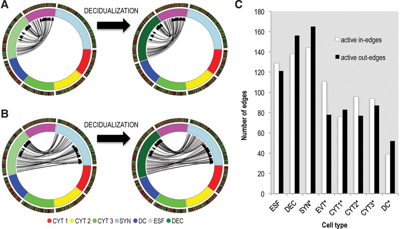 Decidualization increases the cell-cell signaling potential with the adjacent EVT (purple, A) and syncytiotrophoblast (light blue, B). Average cluster gene expression is shown, with genes expressed >5 TPM included. (C) Average numbers of putative interactions per cell type, separated into in- and out-edges. Asterisks refer to the number of interactions in the context of decidua, rather than undifferentiated endometrial stromal fibroblasts.