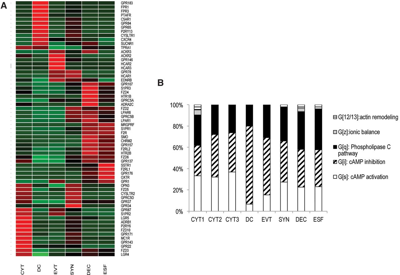 Distribution of G-protein-coupled receptors among cell types. (A) The expression heat map of GPCRs across sampled cells. (B) Characterization of cell clusters by class of G-protein alpha subunit used.