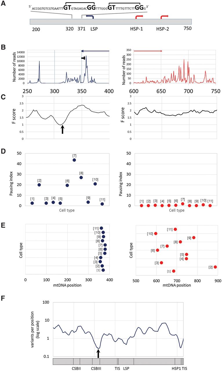 mtDNA transcription consistently pauses at distinct sites near the heavy- and light-strand TIS. (A) mtDNA transcriptional regulation elements. Presented is the complementary human sequence of the light mtDNA strand. The mtDNA sequence around the pausing peak is above the illustrated graph. (Square bracket) The bacterial pausing motif. The mandatory nucleotides within the motif are highlighted by a larger font size. (B) Coverage of the 3′ end of the PRO-seq experiment from K562 cell line. (x-axis) mtDNA nucleotide position; (y-axis) number of reads in the 3′. (Blue and red arrows) The direction of the light- and heavy-strand transcription, respectively. The “horizontal T” sign represents the pausing site. (C) DNase-seq experiment from K562 cell line. (x-axis) mtDNA nucleotide position; (y-axis) F-score of DNase-seq analysis. The lower the score, the more protected is the DNA by proteins. The black arrow points to the DGF site. (D) Pausing index across human cell types. (Left) Light strand; (right) heavy strand. (y-axis) Pausing index values. Dots correspond to the calculated pausing index for each tested cell line (indicated as numbers in brackets near the dots: [1] AC16; [2] CD4+; [3] GM12004; [4] GM 12750; [5] GM12878; [6] HeLa; [7] IMR90; [8] Jurkat; [9] K562; [10] MCF7; [11] U2OS). (E) Pausing site nucleotide position across human cell types. (Left) Light strand; (right) heavy strand; (x-axis) mtDNA position. Dots correspond to the pausing site nucleotide position of each tested cell line (numbering as in D). (F) Human population SNPs density. (x-axis) mtDNA position; (y-axis) SNPs density measured as variants per position (log scale).