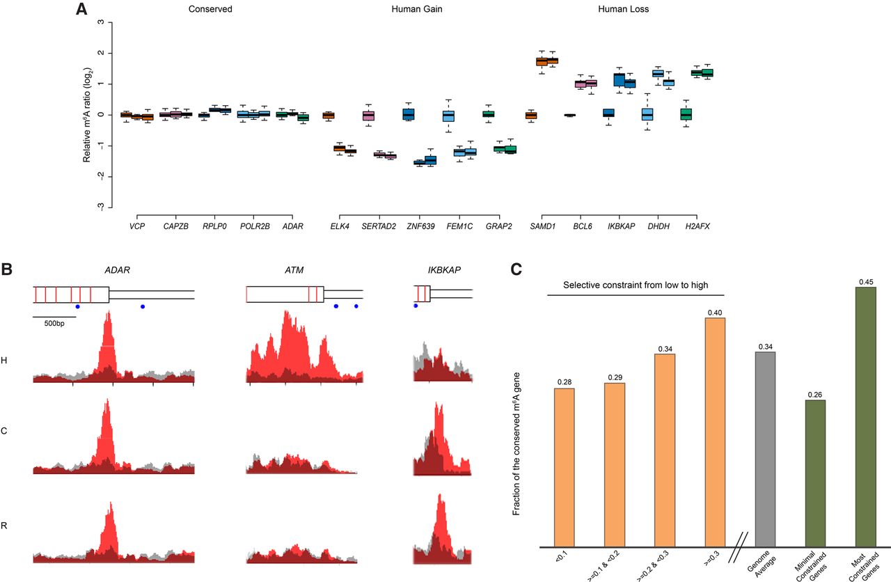 The evolution of m6A modification. (A) The top five genes from the groups of “conserved,” “human gain,” and “human loss” are presented as examples. The m6A signals in the “conserved” group show low variation both within and between species, following the pattern of stabilizing selection. The “human gain” and “human loss” represent m6A modifications specifically changed in human lineage, which follow the pattern of directional selection. Data points from all biological replicates were included. The m6A signals of each biological replicate from chimpanzee and rhesus were normalized to the mean of enrichment score of all human experiments, and the log2 ratio was plotted in the y-axis to represent differential m6A signals between species. For each gene, from left to right represented human, chimpanzee, and rhesus. (B) m6A-IP and input signals were plotted. We chose one example from each of the three categories. Signals on the transcripts of ADAR (adenosine deaminase, RNA-specific), ATM (ATM serine/threonine kinase), and IKBKAP (inhibitor of kappa light polypeptide gene enhancer in B cells, kinase complex-associated protein) represent “conserved,” “human gain,” and “human loss,” respectively. Red represents m6A-IP signal; gray, input. From the top to the bottom: gene structure (wider rectangle indicates exon; narrow rectangle, UTR; red bar, exon boundary; blue dot, GGACT motif), human signal, chimpanzee signal, and rhesus signal. (C) Human m6A-modified genes were split into different groups according to the selective constraint defined in the ExAC (Exome Aggregation Consortium) data (see Methods). With the increase of selective constraint, we observed the increased percentage of conserved m6A modifications. (Four yellow bars) Q1, Q2, and Q3 represented the quartiles of Z-scores defined by ExAC; the lower the Z-scores, the less the selective constraint. (Gray bar) Genome average (N = 5940). (Two green bars) The minimal constrained genes (N = 296) and the most constrained genes (N = 780).