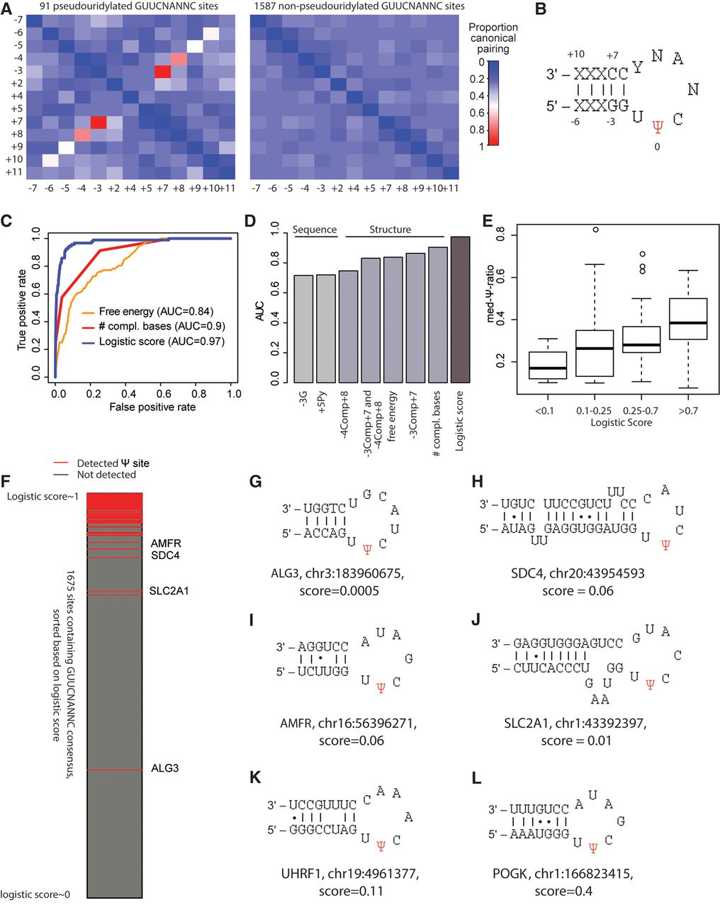 Characterization and modeling of TRUB1 sites. (A) Heat map depicting proportion of sites comprising a TRUB1 consensus sequence in which the indicated pairs of positions (labeled with respect to the Ψ position) are complementary to each other. This analysis was performed separately for 92 sites harboring a GUUCNANNC motif with evidence of pseudouridylation in HEK293 cells (Methods) and for 1587 control sites harboring the same consensus sequence but lacking evidence of pseudouridylation. Only varying positions are depicted, hence excluding positions −2, −1, 0, 1, 3, and 6. (B) Hairpin predicted to form based on complementarity identified in A. (C) Receiver-operator curves (ROCs) for distinct models predicting the likelihood of a site being a TRUB1 substrate based either on predicted free energy of secondary structure calculated for a sequence of 24 bases surrounding the putative Ψ site, the number of complementary bases in the stem (a value from 1 to 4), or a linear combination of all of the features shown in D. (D) Area under the ROC curve (AUC) values shown for prediction of pseudouridylation status based on indicated features. (E) Distribution of Ψ-ratios across four classes of sites, divided according to the logistic regression-based probability of being pseudouridylated. (F) All 1679 TRUB1 consensus-containing sites with sufficient coverage are ranked based on their logistic score and color-coded as indicated based on whether pseudouridylation was detected experimentally. (G–L) Predicted secondary structure of indicated sites that harbor a TRUB1 consensus sequence and are reproducibly detected as pseudouridylated, yet obtain very low logistic regression-based scores of undergoing pseudouridylation. Canonical base pairs are joined by a line; noncanonical G-U pairs are joined by a dot.