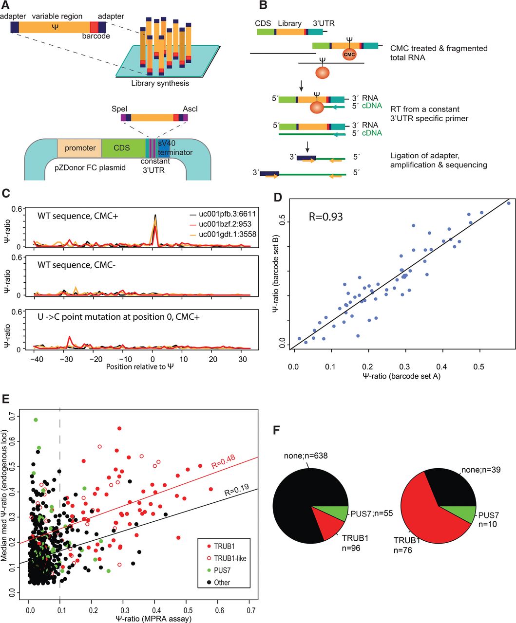 Establishment of massively parallel reporter assay and validation of selected targets. (A) Thousands of sequence variants surrounding pseudouridylated sites or mutated counterparts, each harboring a unique 8-nt barcode and flanked by an adapter set, are cloned downstream from a reporter gene and transfected into cells. (B) Strategy employed for obtaining targeted readouts of pseudouridine within the constructs. Following CMC-treatment, total RNA was reverse-transcribed using a construct-specific primer. A DNA adapter was subsequently ligated to the cDNA, and DNA was amplified using one primer harboring complementarity to the adapter sequence and a second one downstream from the sequence employed for reverse-transcription (Methods). (C) Ψ-ratios across a 70-nt window surrounding three endogenously pseudouridylated sites at TRUB1 targets, within the indicated genes. In all three cases, the pseudouridylation is precisely recapitulated at the correct site in the WT, CMC-treated sample (upper panel) but completely eliminated in the absence of CMC treatment (middle panel), or upon point-mutation of the pseudouridylated site (lower panel). (D) Scatterplot presenting the correlation between Ψ-ratios measured for identical sequences (the set of 74 WT TRUB1 sites), differing only in their 8-nt barcode. (E) Correlation between Ψ-ratios, as captured in the massively parallel reporter assay, and the median med-Ψ- ratios measured across the three large data sets analyzed in this study. TRUB1 sites are defined as harboring a GTTCNANNC consensus, and TRUB1-like sites are defined as GTT[A/G/T]NANNC. The regression curve is plotted in red for all TRUB1 and TRUB1-like sites, in black for all remaining sites. (F) Pie chart depicting the distribution of TRUB1, PUS7, and other consensus sequences throughout the 789 validated sites (left panel) and among all sites with Ψ-ratios > 0.1 (right panel).