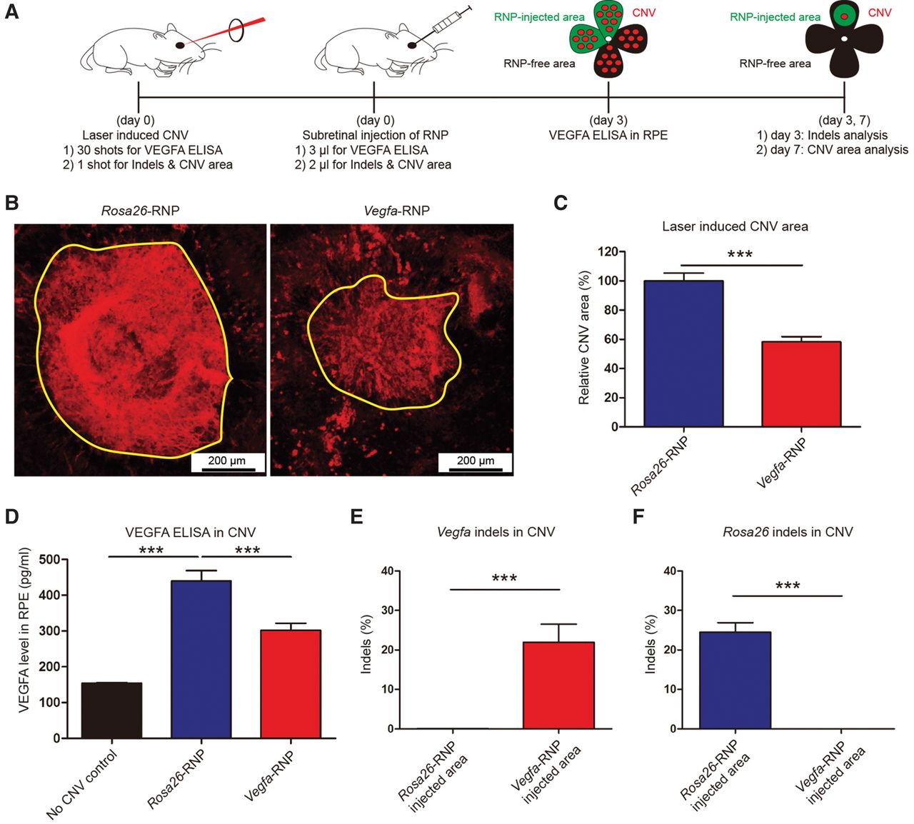 Subretinal injection of Cas9 RNPs targeting Vegfa reduces the area of laser-induced choroidal neovascularization (CNV) in a mouse model of age-related macular degeneration (AMD). (A) Mice with laser-induced CNV were treated with subretinal injection of the Vegfa-specific preassembled Cas9 RNP (Vegfa-RNP). After the retinal pigment epithelium (RPE) complex in the eye was flat-mounted, the CNV area was analyzed at day 7 post-injection. Genomic DNA isolated from the Cas9 RNP-injected area or from the opposite noninjected area (RNP-free area) was analyzed by deep sequencing. VEGFA ELISA was performed at day 3 post-injection. (B) Representative laser-induced CNV stained with isolectin B4 (IB4) in C57BL/6J mice injected with the Rosa26-specific Cas9 RNP (as a control) or the Vegfa-RNP. The yellow line demarcates the area of CNV. (C) The CNV area. Error bars indicate SEM (n = 15). Student's t-test: (***) P < 0.001. (D) VEGFA level in CNV. Error bars indicate SEM (n = 10). One-way ANOVA and Tukey post-hoc tests: (***) P < 0.001. (E) Indel frequencies at the Vegfa target site in the RPE cells. Error bars indicate SEM (n = 5). Student's t-test: (***) P < 0.001. (F) Indel frequencies at the Rosa26 target site in the RPE cells. Error bars indicate SEM (n = 5). Student's t-test: (***) P < 0.001.