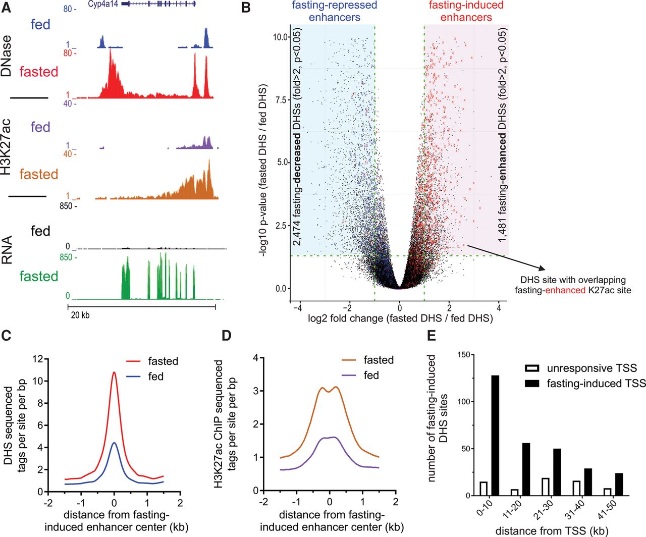 Fasting substantially affects the hepatic chromatin landscape, exposing “fasting-induced enhancers.” (A) Genome browser tracks of the Cyp4a14 locus depicting increases in DNase I hypersensitivity, H3K27 acetylation, and RNA levels upon fasting (24 h; three animals were assayed in each group). (B) Volcano plot of all hepatic DNase I hypersensitive sites. DHS sites within the shaded areas show a significant change in accessibility upon fasting (twofold or greater, adjusted P-value ≤0.05). DHS sites overlapping with fasting-induced H3K27ac sites are depicted by a red X. These DHS sites tend themselves to be enhanced by fasting (mostly to the right). DHS sites overlapping with fasting-repressed H3K27ac sites are depicted by a blue X. These DHS sites tend themselves to be decreased by fasting (mostly to the left). (C,D) DHS (C) and H3K27ac (D) ChIP-seq tag density at fasting-induced enhancers in the fed and fasted states. (E) The number of DHS sites in the vicinity of fasting-induced genes (n = 1055) or unresponsive genes (random set, n = 1055) was plotted as a function of distance from gene transcriptional start site (TSS; plotted in 10-kb bins).