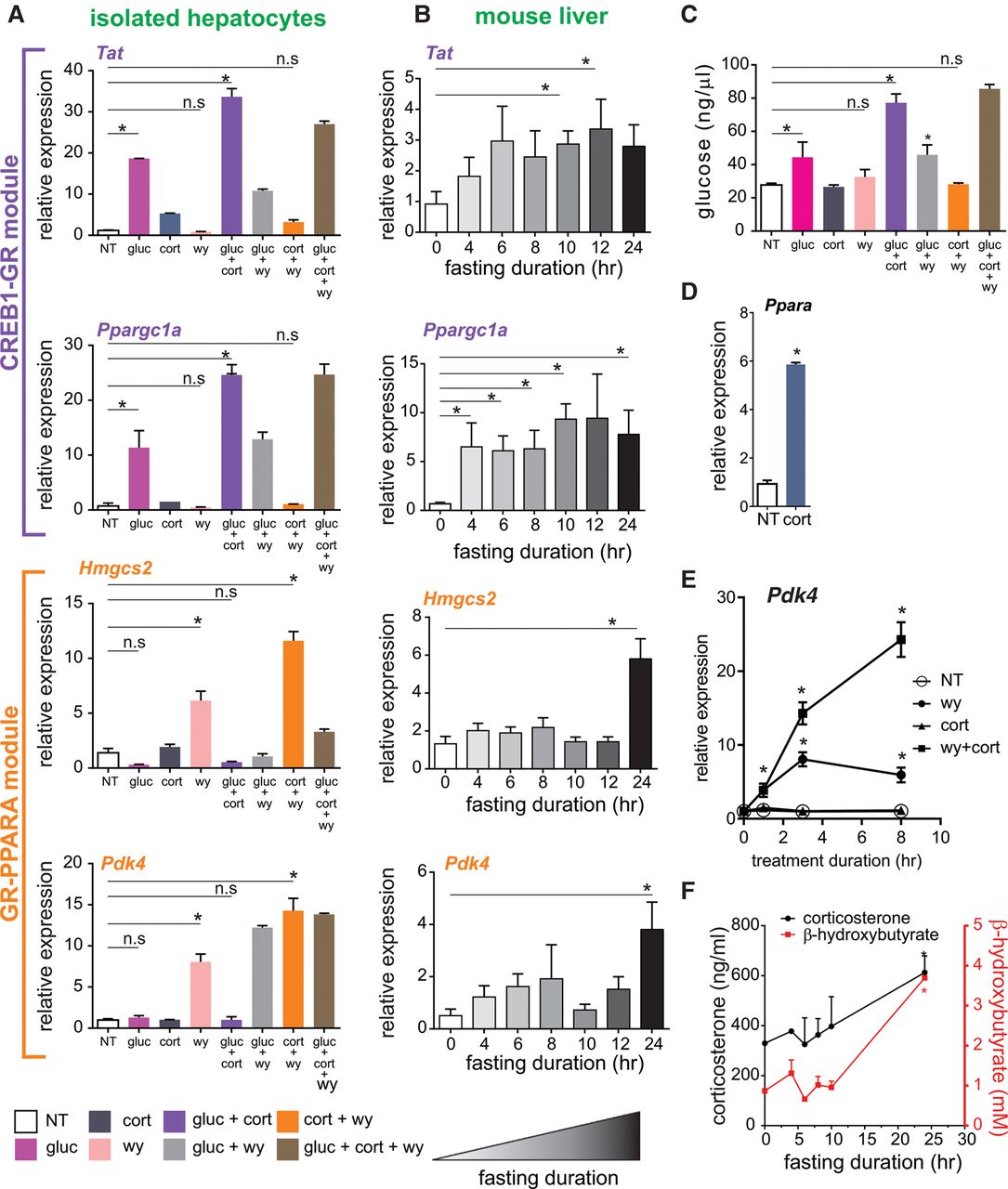 The transcriptional response to fasting in liver is comprised of two TF modules. (A) Nascent RNA levels of fasting-induced genes in primary hepatocytes following a 3-h treatment with different combinations of glucagon (gluc), corticosterone (cort), and WY-14643 (wy). (B) Time course of fasting-induced genes shows an early induction of gluconeogenic genes and a later induction of FAO/ketogenic genes in liver. (C) Glucose production in primary hepatocytes following treatment with different combinations of glucagon, corticosterone, and WY-14643. (D) Nascent RNA levels of Ppara following corticosterone treatment (3 h) in primary hepatocytes. (E) Nascent RNA levels of Pdk4 in primary hepatocytes following 1, 3, and 8 h of treatment with different combinations of WY-14643 and corticosterone: (*) statistical significance (P ≤ 0.05) compared to a nontreated sample (NT) in each time point. (F) Time course of serum corticosterone and β-hydroxybutyrate levels during fasting: (*) statistical significance (P ≤ 0.05) compared to control values (fed). (n.s.) Not significant.