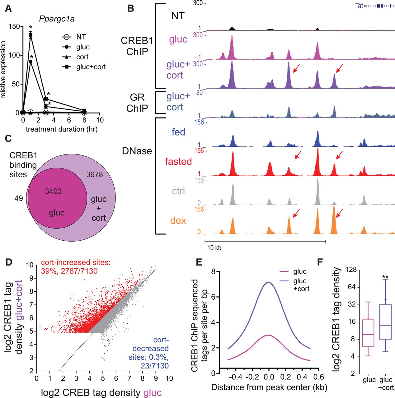 Corticosterone increases the number of CREB1 binding sites and CREB1 binding intensity. (A) Nascent RNA levels of Ppargc1a in primary hepatocytes following 1, 3, and 8 h of treatment with different combinations of glucagon (gluc) and corticosterone (cort): (*) statistical significance (P ≤ 0.05) compared to a nontreated sample (NT) in each time point. (B) Genome browser tracks of the Tat locus depicting increases in CREB1 binding following glucagon treatment (1 h) and cotreatment with corticosterone (1 h) as well as increased accessibility following either fasting or GR activation by dexamethasone (dex). Adrenalectomized mice were treated with dex (1 mg/kg) for 1 h, DNase-seq data were generated and described in Grøntved et al. (2013). (C,D) Cotreatment with glucagon and corticosterone leads to an increase in the number (C) and intensity (D) of CREB1 binding sites. (E,F) Corticosterone-increased CREB1 binding sites show more CREB1 binding than corticosterone-unaffected sites (measured by ChIP-seq tag density). (**) Statistical significance (P ≤ 0.0001).