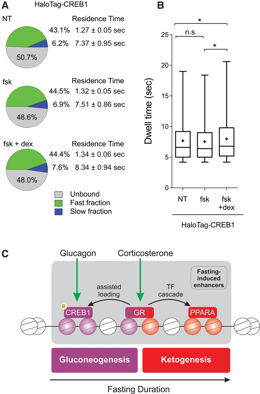 GR increases the number and residence time of CREB1 molecules. (A) Summary of single-molecule tracking data. The percentage of the unbound, fast-bound, and slow-bound fractions as well as each fraction's average residence time is depicted under different treatments: (fsk) forskolin; (dex) dexamethasone. (B) Box plot depicting dwell time distributions of CREB1 molecules under different treatments. (*) Statistical significance (P ≤ 0.05) compared to indicated sample. (n.s.) Not significant. (C) A model for hepatic TF dynamics during fasting. The liver is exposed to glucagon in early fasting, leading to CREB1 activation by phosphorylation. At midterm fasting, GR is activated by increasing levels of corticosterone leading to two trajectories: First, GR assists the loading of CREB1 onto gluconeogenic enhancers resulting in synergized gluconeogenic gene expression and glucose production; and second, GR induces the gene level of PPARA which, as fasting persists, promotes a FAO/ketogenic gene program.