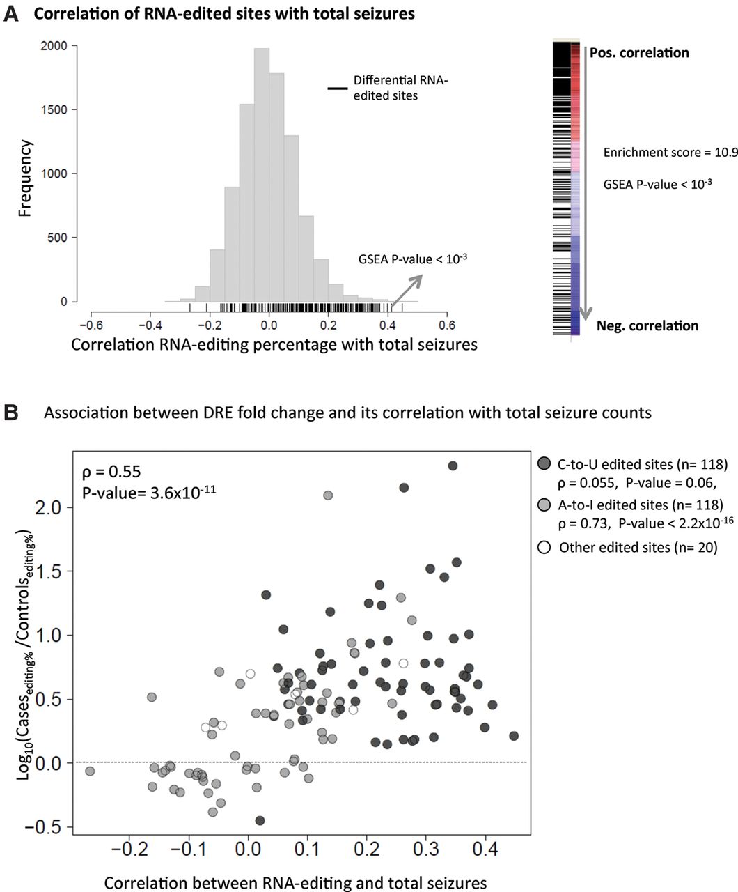 Relationship between RNA editing in the hippocampus and seizure frequency (here, measured as total seizure counts over a standardized period of 14 continuous days of monitoring). (A) Correlation between RNA-editing percentages and total seizure counts in the 100 epileptic mice. (B) Association between RNA-editing fold change and correlation between RNA-editing percentage and total seizures in epileptic mice. C-to-U sites are represented as solid black circles, while A-to-I sites are solid gray circles. All other sites are represented as white circles with a black outline.