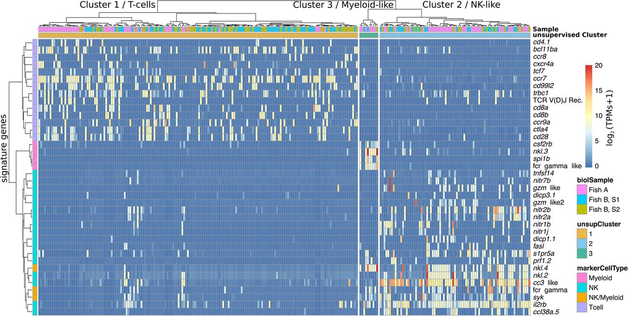Heatmap showing the expression levels of important differentially expressed marker genes. Columns and rows represent cells and marker genes, respectively. Colors of the columns show the plates (top row) and the assigned clusters for each cell based on unsupervised whole-transcriptome clustering (second row; dendrogram shown on top). Colors of the rows (left-most column) indicate the known function of marker genes based on the literature (T-cell, NK, or myeloid marker). The heatmap color scale indicates the log2 TPMs (see Methods). Apart from a few cells in the T-cell cluster that show expression of NK markers, the unsupervised whole-transcriptome clustering is very well recapitulated by expression of known and putative cell-type markers.