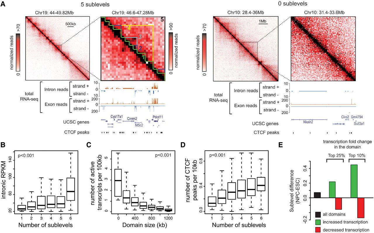 Local (changes in) folding complexity correlate with transcriptional activity in ESCs and during differentiation. (A) Examples of regions with different levels of local folding complexity and correlated transcriptional activities. (B) The number of sublevels in a domain correlates with the transcriptional activity within the domain (shown for domains at 65% RI in ESC). P-value: Student's t-test associated to Spearman's correlation coefficient. (C) Smaller domains tend to be denser in actively transcribed genes and therefore globally more active than larger domains (shown for domains at 65% RI). (D) The number of sublevels in a domain correlates with the density of CTCF-bound sites within the domain (shown for domains at 65% RI). (E) Local changes in transcriptional activities during differentiation from ESCs to NPCs correspond to changes in local hierarchical complexity (see Methods). Differences in the number of hierarchical sublevels are shown for the 25% and 10% most up- or down-regulated domains identified at 65% RI in ESC.