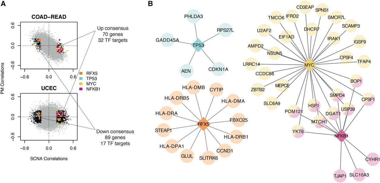Comparison of gene signatures present in UCEC and COAD-READ. (A) Correlation distributions of COAD-READ and UCEC. Black dots represent FDRSCNA < 5% and FDRPM > 5%. Colored dots represent regulated genes predicted by iRegulon (corresponding transcription factors in legend). Text describes overlap between negative (down consensus) and positive (up consensus) correlating sets. (B) Predicted transcriptional networks based on iRegulon. Circular nodes represent target genes, with predicted regulators denoted by diamonds.