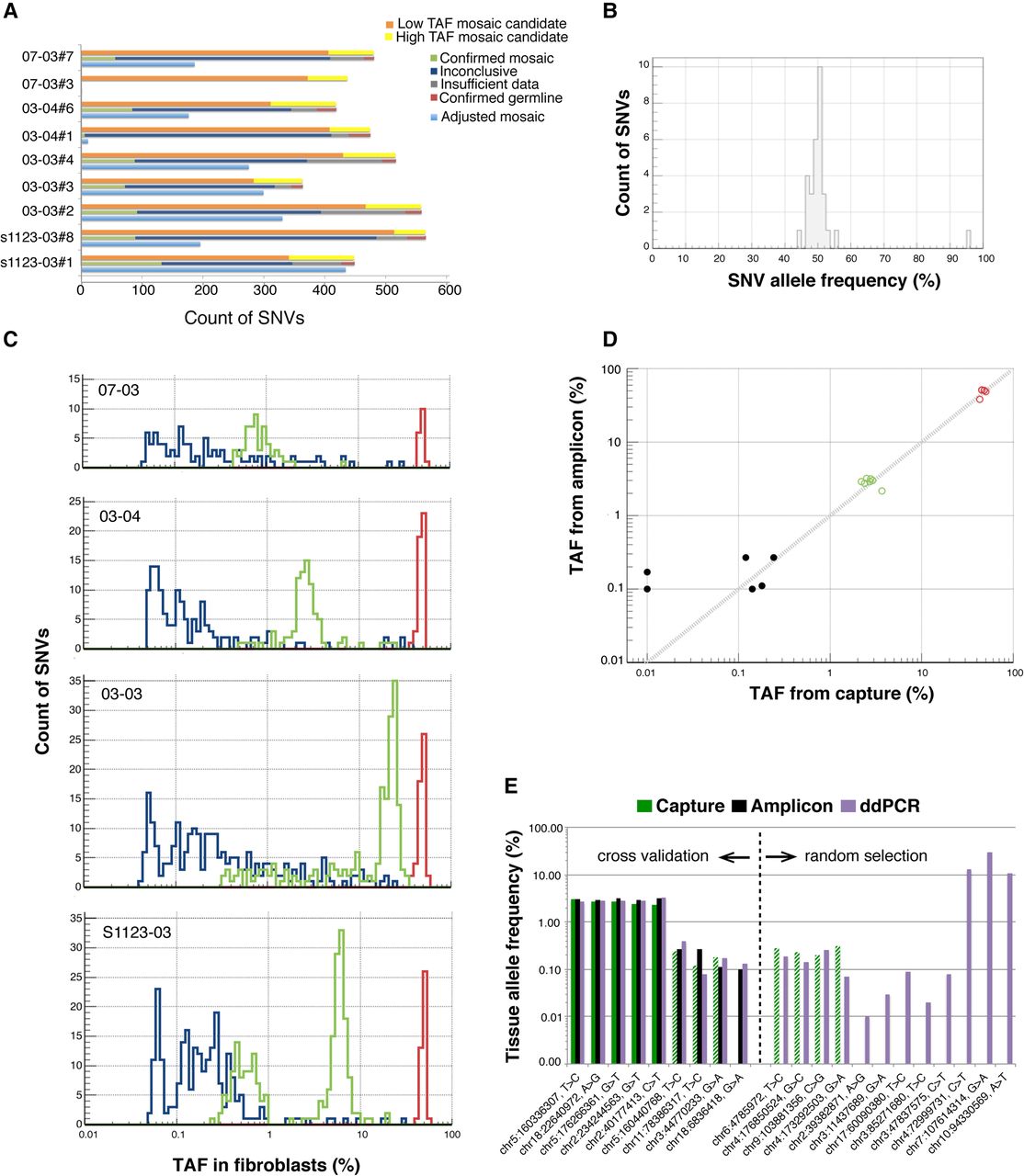 Discovery and confirmation of LM-SNVs in children. (A) Discovered LM-SNVs in hiPSC lines were divided into two groups: low tissue allele frequency (with no evidence in fibroblasts, orange bars), and high TAF (with some evidence, yellow bars). Site reanalysis in fibroblasts with DNA capture and deep sequencing confirmed that, on average, 74 LM-SNVs in each hiPSC line are mosaic SNVs in fibroblasts (green bars) or 235 when adjusted for discovery sensitivity and ascertained fraction (light blue bars). (B) Virtually all LM-SNVs were present at around 50% AF in hiPSC lines as detected by amplicon-seq experiments. (C) Capture-seq experiment in fibroblasts revealed that mosaic SNVs were present in the fibroblast tissue with TAF ranging from 0.25% to 35%. Distributions of TAF have clear peaks. (D) Amplicon-seq experiment for 57 LM-SNVs sites results in better sensitivity and confirms an additional six LM-SNVs with low TAF as mosaic (black dots), including two with no supporting read in the data from capture (shown with TAF of 10−4 for capture). Germline and confirmed mosaic SNVs by capture experiments are in red and green circles, respectively. (E) ddPCR reactions revealed excellent concordance in TAF estimates with the capture-seq and amplicon-seq experiments. Dashed green bars show SNV sites for which capture experiments were conducted, but support for the alternative allele was consistent with background sequencing noise. Additional ddPCR assays confirmed mosaic SNV at even lower TAFs that could not be accessed by the other two experiments.