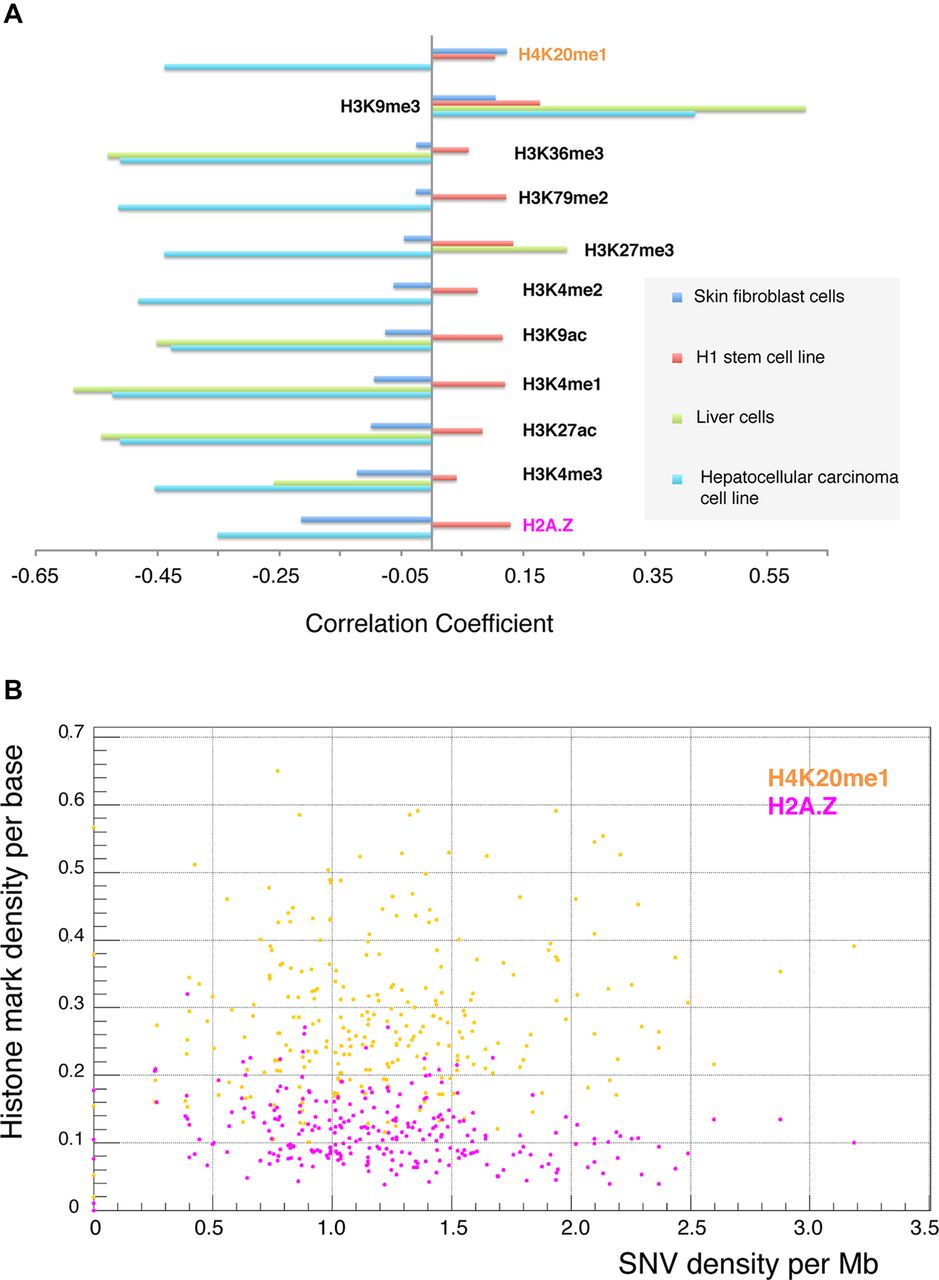 (A) Mosaic SNVs in fibroblasts (detected in this study) exhibit negative correlations (except for the H4K20me1 mark) with histone marks from skin fibroblasts (blue bars). This is similar to what was observed for somatic SNVs in liver cancer (external data set) with histone marks from hepatocytes (green) and hepatocellular carcinoma cell line (cyan). However, the absolute values of correlations are lower. Data for certain histone marks are not available, and the corresponding bars are not shown. In contrast, mosaic SNVs in fibroblasts correlate positively with histone marks in stem cells. Correlations for the H1 cell line are shown in red (see also Supplemental Fig. S9). (B) Example of correlation between density of mosaic SNVs in fibroblasts and two histone marks in fibroblasts.