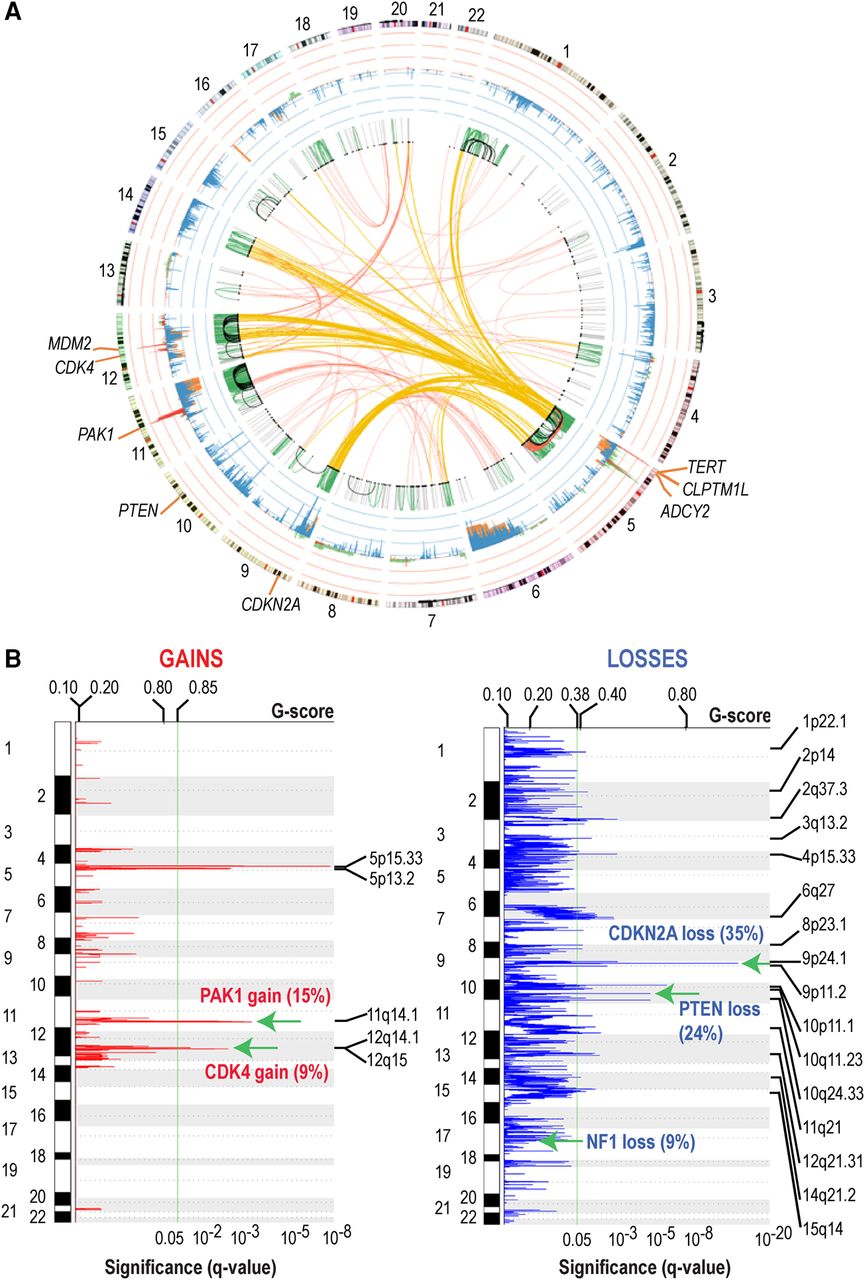 Consensus somatic SVs and CNVs. (A) Summary of somatic SVs and CNVs. Intrachromosomal SVs: (gray) <1 Mb; (green) ≥1 Mb and <50 Mb; (black) ≥50 Mb and <100 Mb; (red) ≥100 Mb. Interchromosomal SVs are shown in red; interchromosomal SVs impacting Chr 5 are in yellow. Consensus CNVs are shown in the inner circle adjacent to chromosomes: (red) exome CNV gain; (green) LIWG CNV gain; (blue) exome CNV loss; (orange) LIWG CNV loss. (B) Consensus CNVs. Selected common gains and losses are indicated by green arrows. The percentage of impacted tumors is shown in parentheses. The plot shows the Q-values; Benjamini and Hochberg FDR (bottom) and G-score (top), with the copy number gains (left) indicated in red and copy number losses (right) in blue. Chromosome positions are indicated along the y-axis.