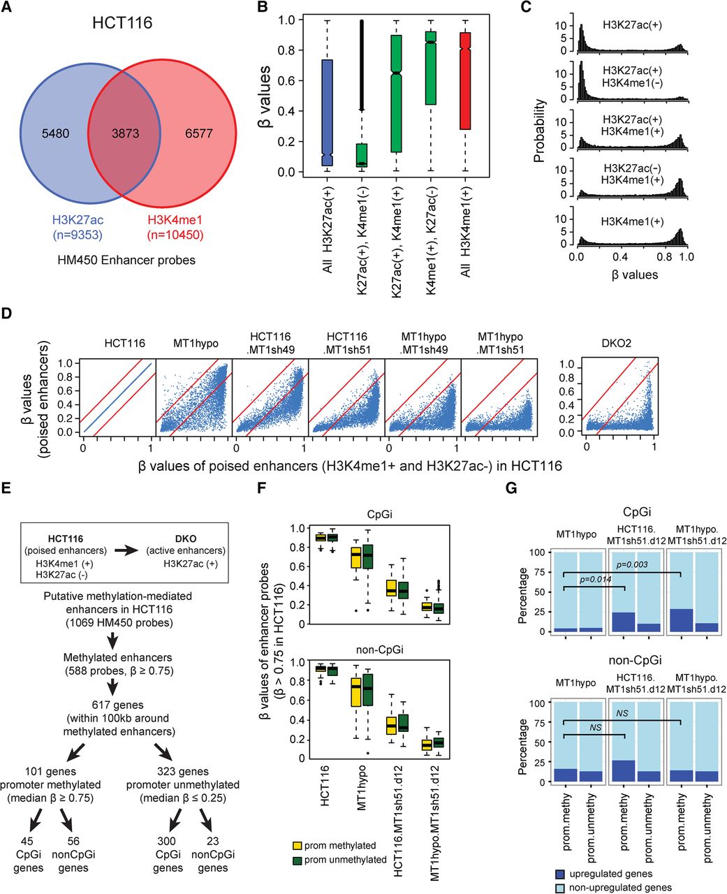DNA methylation profiles in gene enhancers. (A) Infinium Methylation 450K (HM450) probes that overlap with putative enhancers marked by either H3K27ac or H3K4me1. (B,C) DNA methylation levels of putative enhancers in HCT116 depicted in whisker box plots (B) and histograms (C). In B, β values (y-axis) are matched to enhancer histone modification status as determined by ENCODE (encodeproject.org) (The ENCODE Project Consortium 2012) (x-axis). (D) DNA methylation levels of poised enhancers (H3K4me1+ and H3K27ac−) in HCT116-derived clones with various DNMT1 protein levels. The x-axis shows β values for wild-type HCT116 cells (range; first panel); the y-axis shows β values for DNMT1 knockdowns or knockouts and DKO cells. (E) Flow chart for selection of putative enhancers stratified by methylation analyses and that have been denoted by ENCODE to be poised in HCT116 wild-type cells and that became active in HCT116-DKO cells (Blattler et al. 2014). The putatively controlled genes for these enhancers (50 kb upstream or downstream) have been determined by informatics analyses outlined in the text. HM450 probes that are located within the poised enhancers and heavily methylated (β values ≥0.75) are included in the analyses. (F) Whisker box plots for methylation levels (y-axis) of poised enhancer probes (β values ≥0.75) in HCT116 cells with different DNMT1 levels. Genes are grouped according to their promoter CpG islands and methylation status. The yellow box represents genes with methylated promoters (average β values ≥0.75), and the green box represents genes with unmethylated promoters (average β values ≤0.25). (G) Percentage of genes (y-axis) with up-regulated (defined by being 1.4-fold or greater than basal values in wild-type HCT116 cells; dark blue portion of bar) versus unchanged expression (light blue portion of bar) following the DNMT1 depletions outlined in F (shown at the tops of the panels). The analysis included 617 genes defined in E. P-values, indicated by the bars in the panels, are calculated for Fisher's exact test.