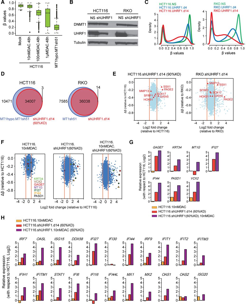 UHRF1 inhibition augments the DNA demethylation effect of low-dose DAC. (A) Whisker box plots for methylation levels (y-axis) of promoter probes in HCT116 cells treated with different concentrations of decitabine (DAC) for 48 h and in HCT116 MT1hypo cells treated with DNMT1 shRNA (sh51) for 12 d. The analysis includes methylated promoter CpGi probes (β values greater ≥0.75) in HCT116 cells. (B) Western blot analysis of UHRF1 and DNMT1 in HCT116 and RKO, with alpha tubulin as loading controls: (NS) nonsilencing shRNA control. (C) Genome-wide DNA methylation profiles at days 4 and 14 following UHRF1 knockdown (β values between 0 and 1; x-axis) versus probability densities that describe the distribution of β values for all probes (y-axis). (D) Venn diagram of Infinium 450K probes demethylated by DNMT1 and UHRF1 knockdowns. The analysis includes promoter probes with β values greater than or equal to 0.75 in HCT116 and RKO cells and that show a decrease of more than 0.2 upon knockdown of DNMT1 or UHRF1. (E) Expression-methylation plots of HCT116 and RKO cells subject to UHRF1 shRNA knockdown (∼90% reduction of UHRF1). The y-axis denotes changes in average β values for individual genes with respect to those in the parental HCT116 or RKO cells. Only genes with hypermethylated promoter (β values ≥0.75) are examined. The x-axis denotes log2 fold changes in gene expression relative to the parental HCT116 or RKO cells. (F) Expression-methylation plots of HCT116 following DAC treatment, 60% UHRF1 knockdown or a combination of both. (G) Quantitated gene expression changes of the seven representative genes marked in F in HCT116 cells following DAC treatment (yellow bars), UHRF1 knockdown (red bars), or a combination of both (purple bars). The y-axis denotes log2 fold changes of gene expression relative to that in the untreated HCT116 cells. (H) Gene expression changes of immune-related, viral defense genes following DAC treatment (yellow bars), UHRF1 knockdown (red bars), or a combination of both (purple bars).