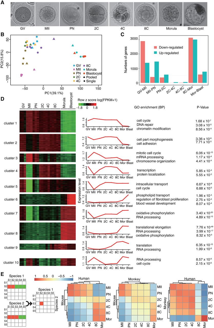 Gene expression profiling of the rhesus monkey oocytes and preimplantation embryos. (A) Brightfield images of the GV oocyte (GV), mature oocyte (MII), one-cell embryo at the pronucleus stage (PN), two-cell embryo (2C), four-cell embryo (4C), eight-cell embryo (8C), morula, and blastocyst. (B) Principal component analysis (PCA) of the transcriptomes of individual- and pooled-oocyte/embryo samples. Two major clusters were identified, suggesting two discrete developmental stages. (C) Histogram showing up- and down-regulated genes between each of the two adjacent stages identified by DESeq2 (FDR < 10−5). (D) DESeq2 identified 6963 differentially expressed genes (DEGs). These DEGs were then clustered into 10 groups by BICSKmeans. Their average log transformed expression values, representative Gene Ontology (GO) terms, and corresponding enrichment P-values are listed. (E) Comparative transcriptome analysis and Pearson correlation coefficient (PCC) between species of pairwise PCCs within each species. (C–E) Based on monkey individual-oocyte/embryo sequencing data. Similar results for the pooled-embryo data are shown in Supplemental Figure S2.