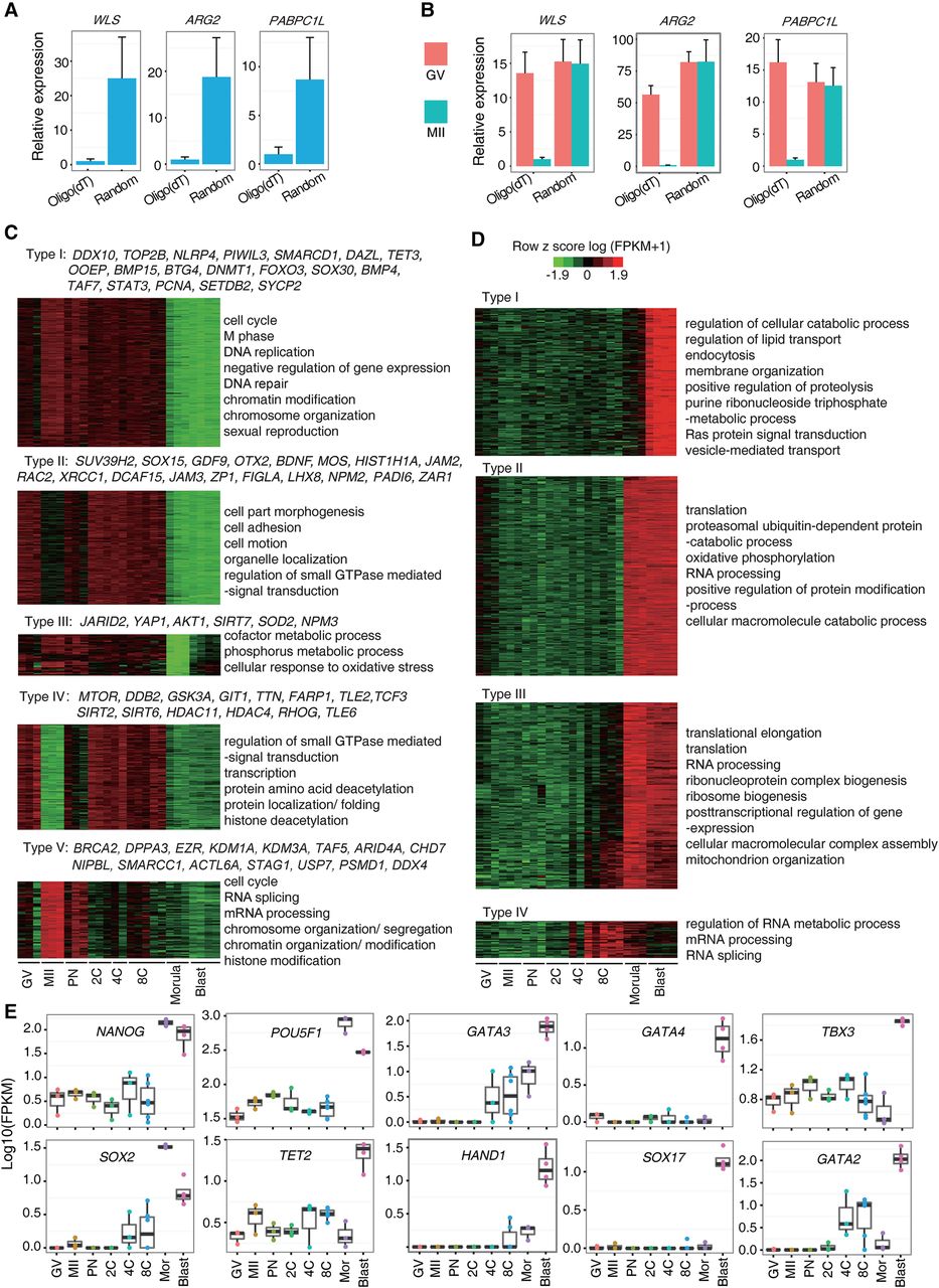 Classification of maternal and zygotic genes. (A) Real-time PCR examination in cDNA samples of MII oocytes. Gene expression levels were significantly higher in samples reverse-transcribed with random primers than in those prepared with oligo(dT) primers. (B) Real-time PCR examination in cDNA samples of GV and MII oocytes. Gene expression levels were comparable between GV and MII oocytes when cDNAs were prepared with random primers, but showed significant difference when cDNAs were prepared with oligo(dT) primers. (C) Five expression patterns of maternal genes were identified. Typical genes and representative GO terms are listed. (D) Four expression patterns of zygotic genes were identified. Their representative GO terms are shown. (E) The expression patterns of several zygotic genes implicated in the cell-fate determination. (C–E) Based on monkey individual-oocyte/embryo sequencing data. Similar results for the pooled-embryo data are shown in Supplemental Figures S4 and S5.