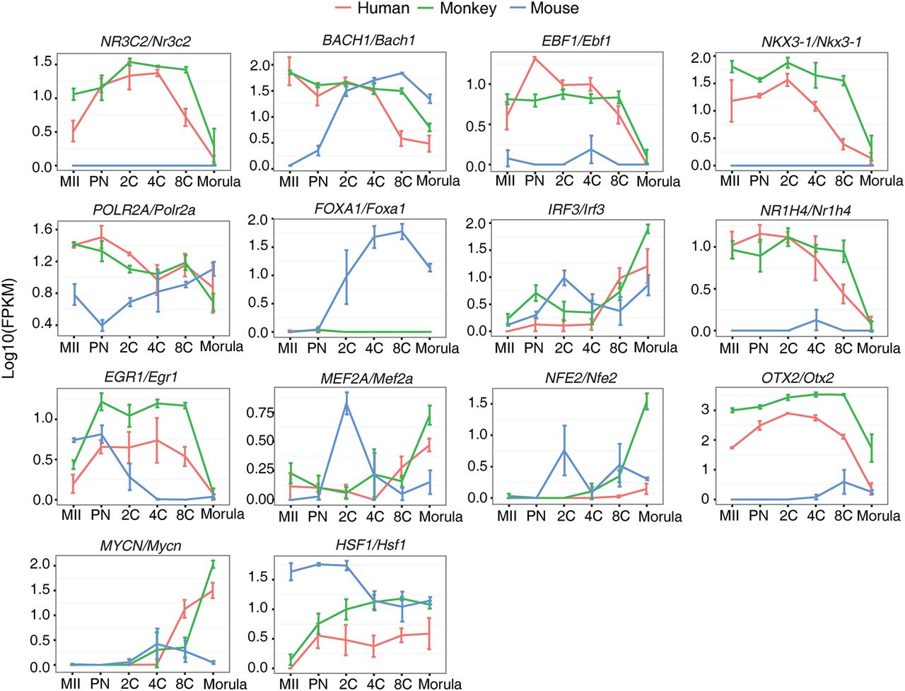 Transcription factors (TFs) with differential expression patterns between primate and rodent. The pairwise PCC was calculated. TFs, which have P-value <0.05 between human and monkey and P-value >0.05 between human and mouse or between monkey and mouse, were considered to be differentially expressed between primate and rodent. This figure is based on monkey individual-oocyte/embryo sequencing data. Similar results for the pooled-embryo data are shown in Supplemental Figure S7.