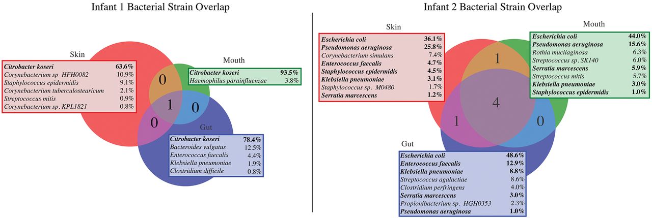 Identical bacterial strains colonize multiple body sites of premature infants. Microbes were considered colonists of a body site if they make up >1% of a community. All colonists of each site are shown, along with the total percentage of the community they make up across all sampling events. Colonists of multiple sites are shown in bold.