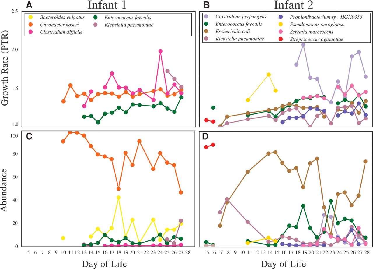Growth rates (determined by PTR) often do not predict changes in relative abundance of a population in subsequent samples. Growth rate measurements for all gut colonists are shown in A and B. Corresponding relative abundance information is shown in C and D. The lack of correspondence between increased PTR in one sample and increased relative abundance in the next sample could be due either to the transient nature of growth spurts or to the fact that cell death is not accounted for in this analysis.